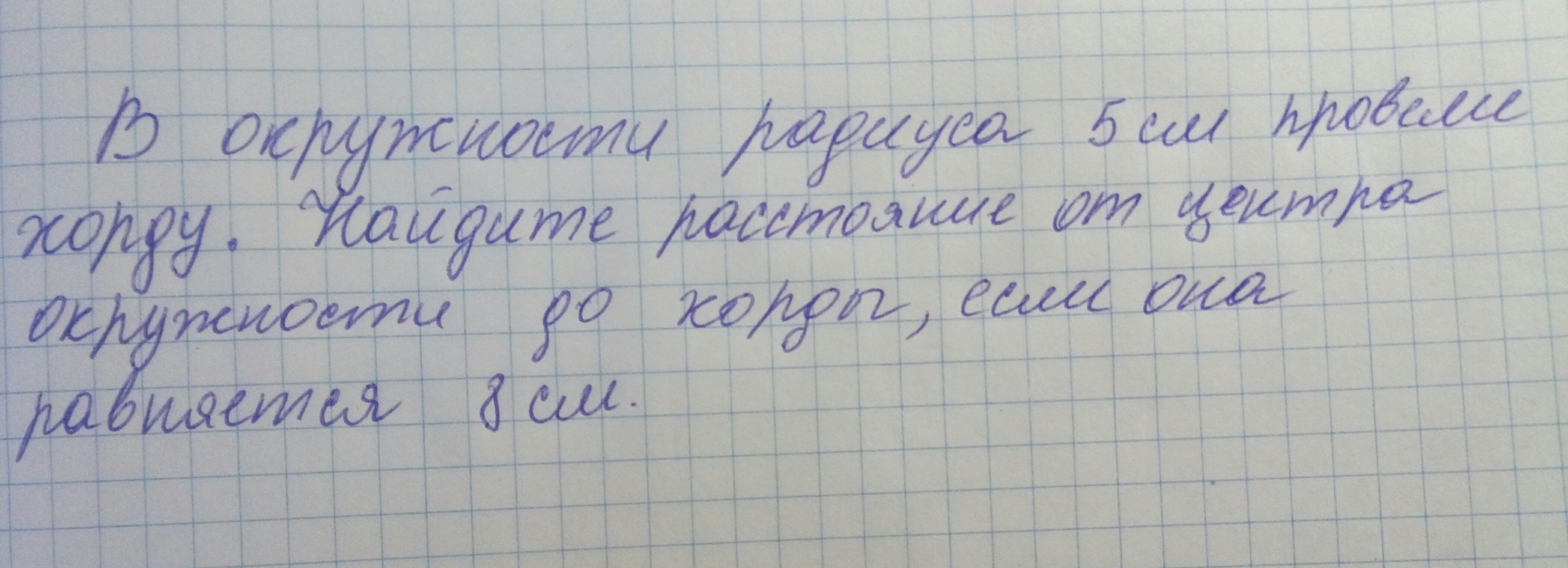 Расстояние от Центра окружности до хорды -- это перпендикуляр, опущенный из центра на хорду. Он делит хорду пополам, следовательно