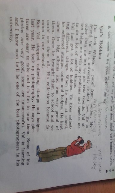 Я Джек Вилсон, ученик из Лондона. Мой друг Вол сейчас учится в университете. Он старше меня и учит меня делать много вещей. У Вола много хобби. Ему нравится коллекционировать разные вещи. Когда он учился в школе,он коллекционировал марки, монеты и значки. Он хранил их в больших альбомах и очень гордился ими. Однажды он принес их в школу,чтобы мы могли увидеть их. Его коллекции стали популярны в школе. Но Вол перестал коллекционировать марки и значки в прошлом году.Он занялся фотографией. Он говорит,что фотографировать легко и ему нравится это. Некоторые из его фотографий очень хорошие, а некоторые неудачны. Вол учится и я знаю, что скоро он станет лучшим фотографом в своем университете.
