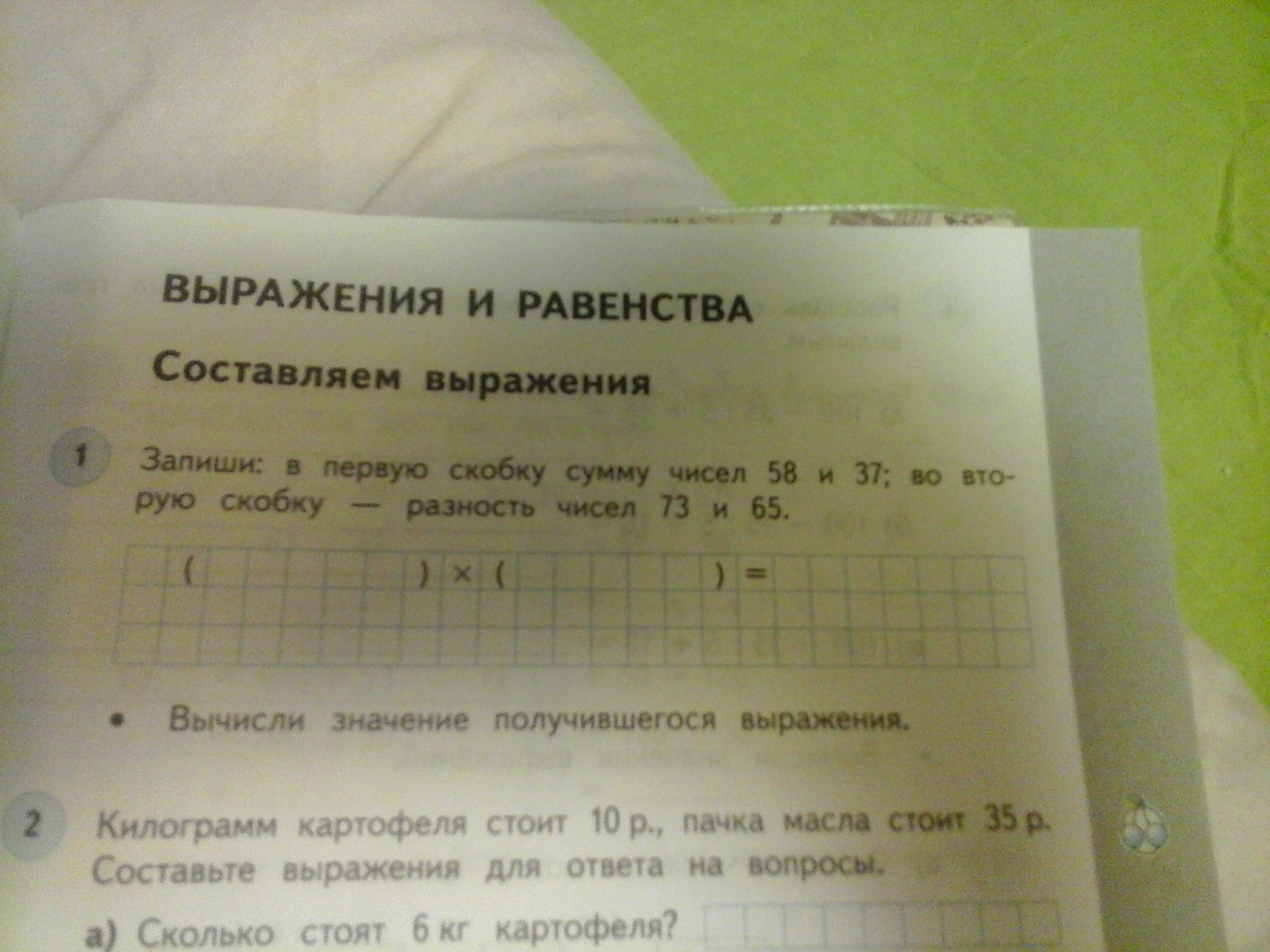 Запиши: в первую скобку сумму чисел 58 и 37; во вторую скобку - разность чисел 73 и 65.