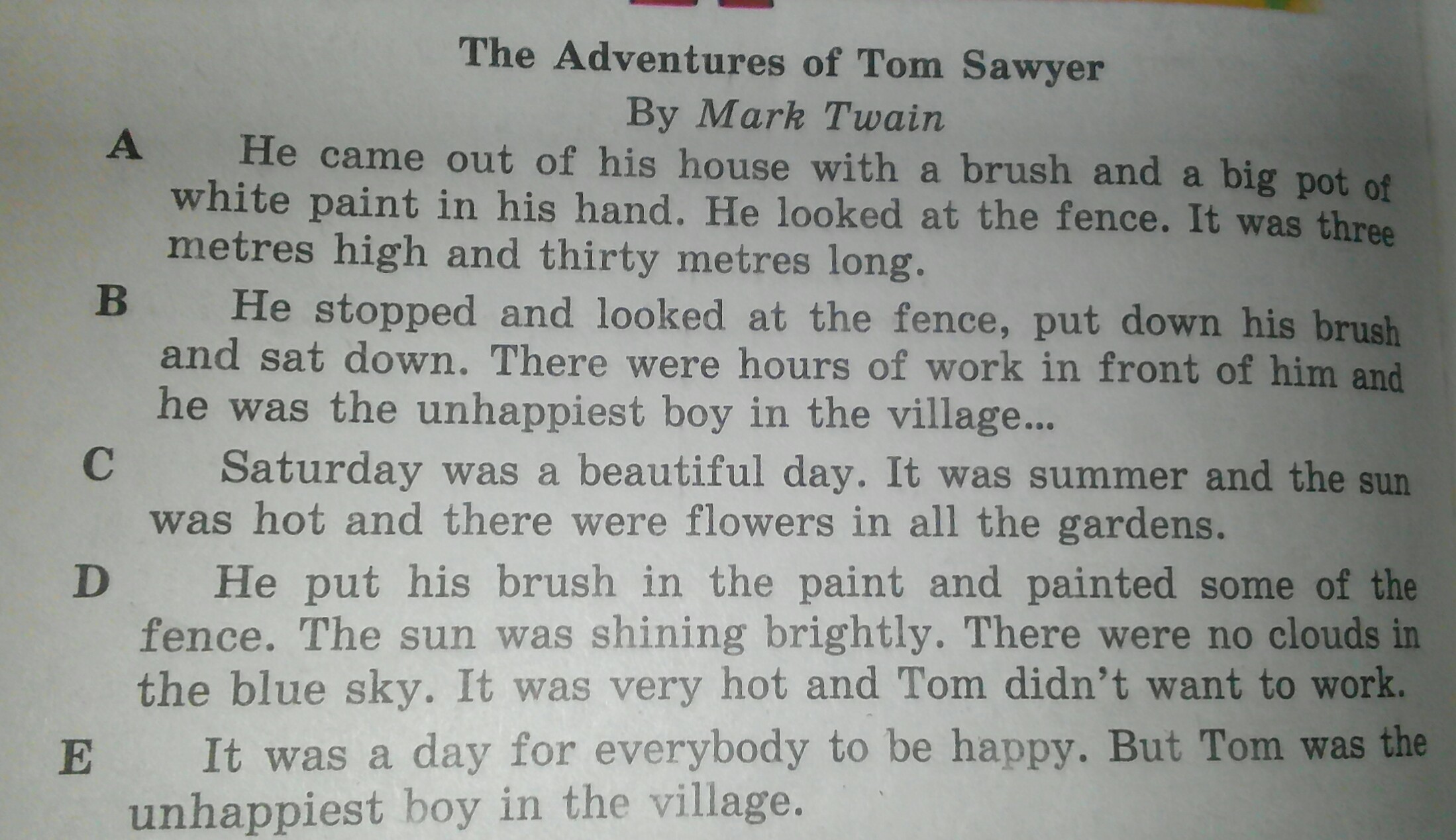 Он вышел из дома держа в руках кисть и горшок белой краски. Он смотрел на забор. Он был 3 метра в высоту и 30 в длинну