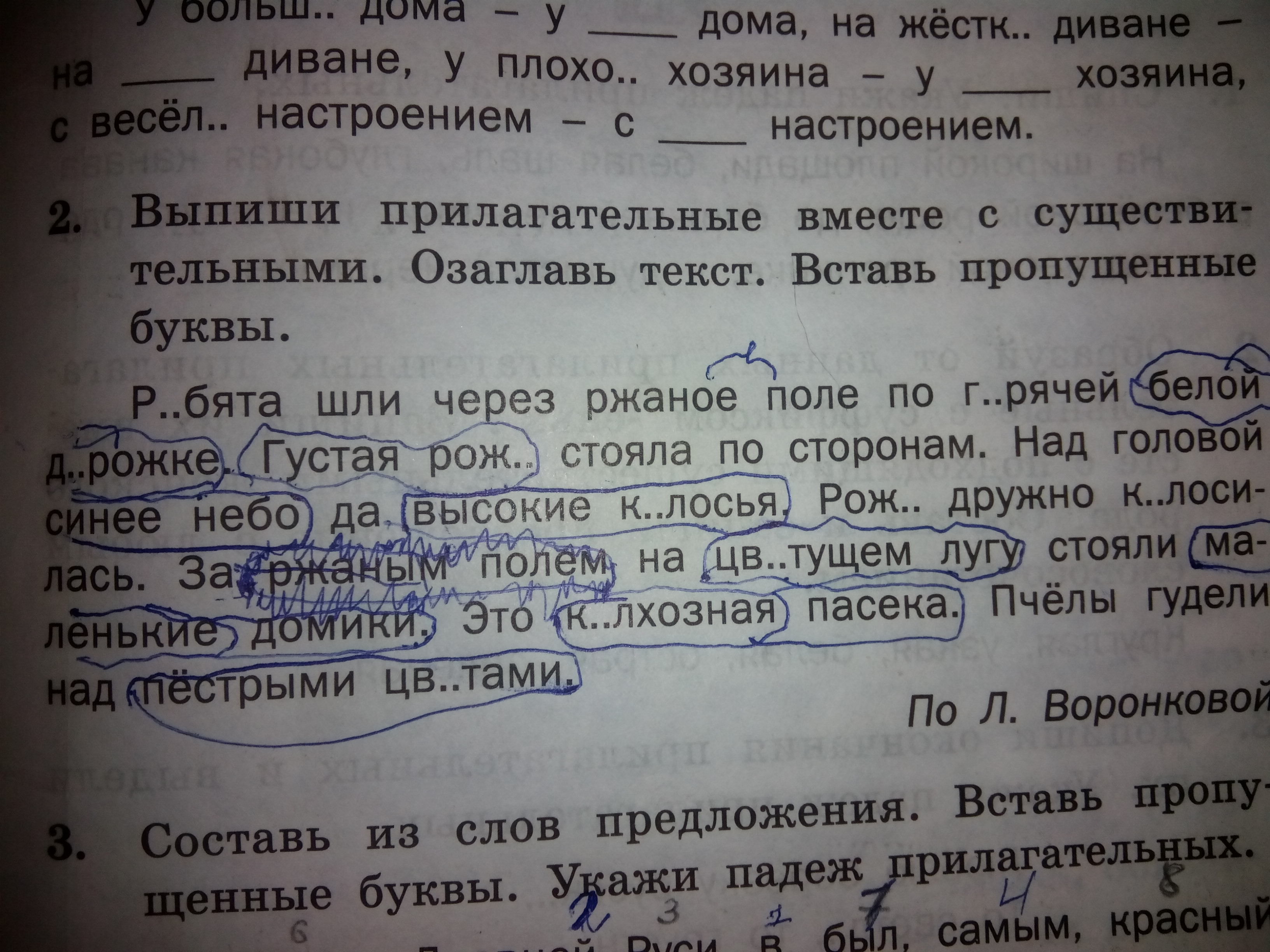 Ржаное поле, по горячей дорожке, по белой дорожке, густая рожь, синее небо, высокие колосья, на цветущем лугу, за ржаным (каким? - ржаным - прил.) полем ( чем? - полем - сущ., творительный падеж), на цветущем лугу, маленькие домики, колхозная пасека, над пестрыми цветами.