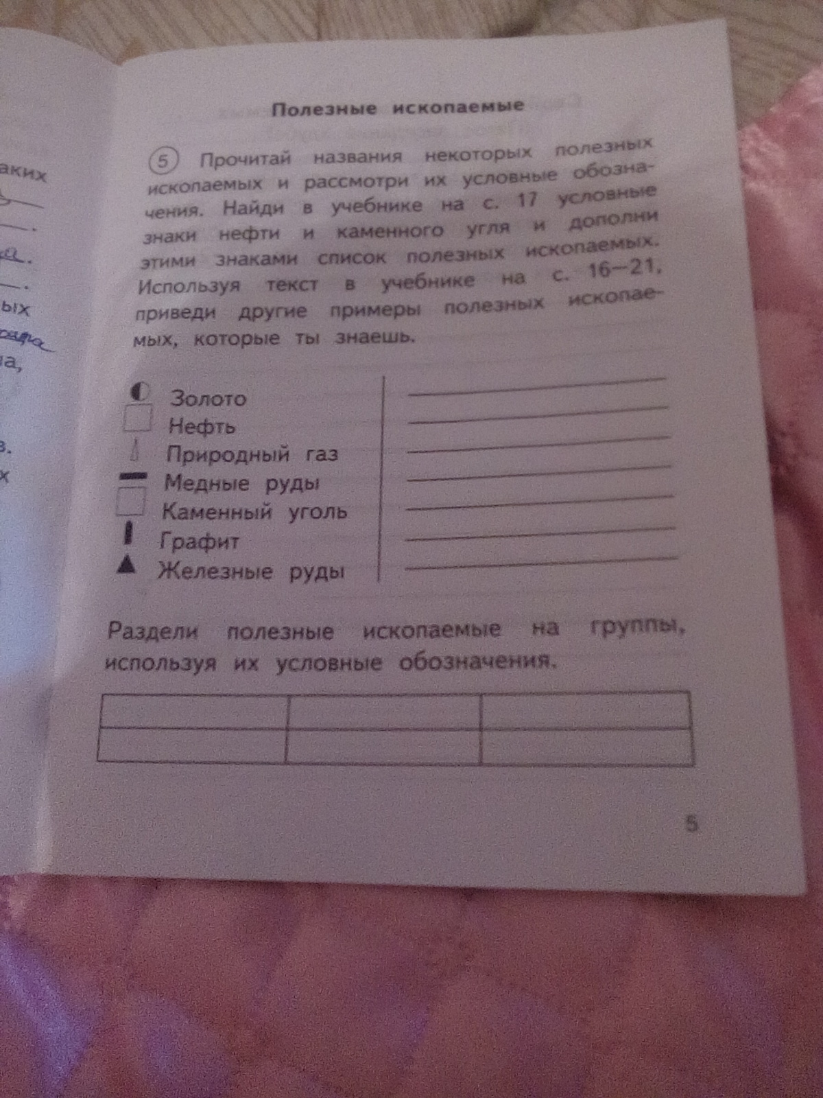 прочитай названия некоторых полезных ископаемых и Рассмотри их условные обозначенияНайди в учебнике на странице 17 условные знаки нефти и каменного угля и дополни этими знаками список полезных ископаемых используя текст учебника 16 21 Приведите примеры полезных ископаемых которые ты знаешь