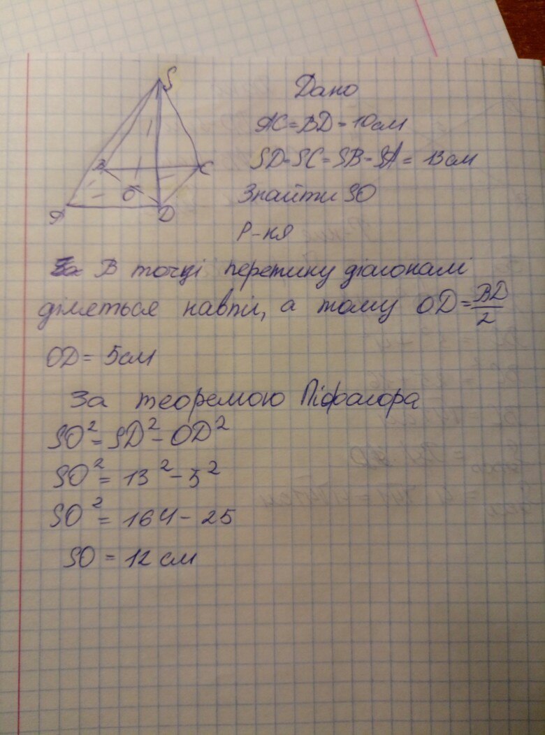У правильній чотирикутній піраміді бічне ребро дорівнює 13 см,а діагональ основи 10 см. Знайдіть висоту піраміди