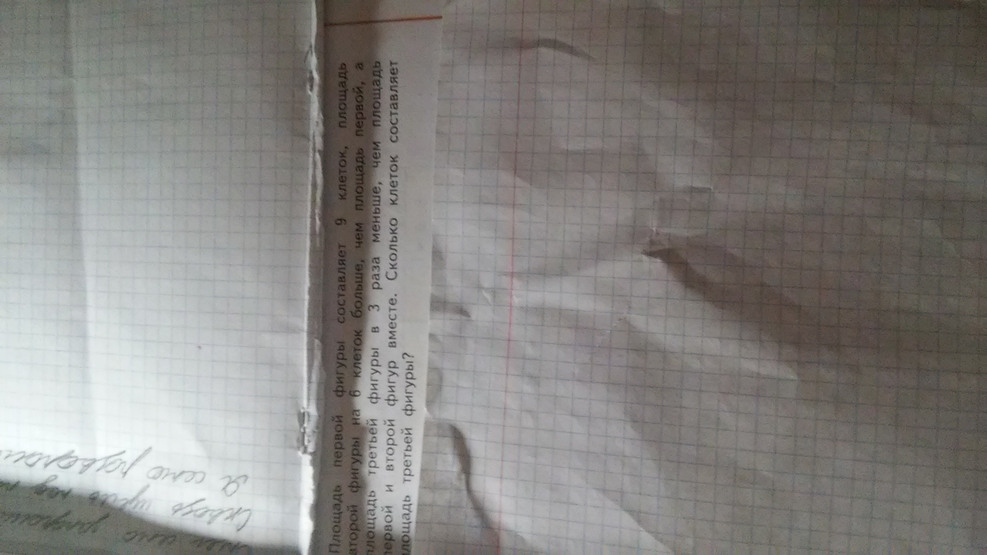 площядь первой фигуры состовляет 9 клеток площядь второй фигуры на 6 клеток больше чем площядь первой а площядь третей фигуры в 3 раза меньше чем площядь первой и второй фигуры вместе. Сколько клеток состовляет площядь третьей фигуры.