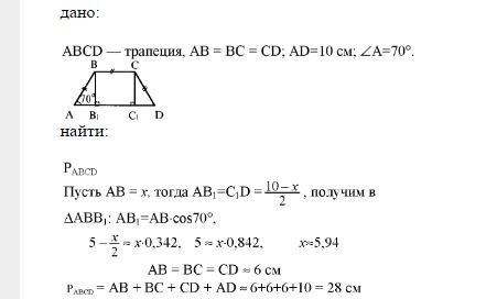 В равнобдренной трапеции меньшее основание равно боковой стороне, большее основание равно 10см, а угол при основании равен 70 градусов. Найдите периметр трапеции