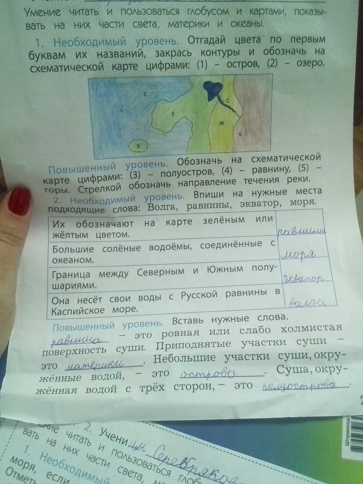 отгадай цвета по первым буквам их названий,закрась контуры и обозначь на карте 1.остров2.озеро3.полуостров4.равнину5. горы,стрелкой обозначь направление течения реки