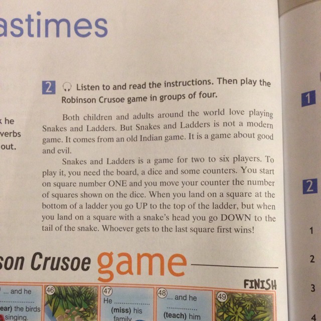 Змейки и Лестницы - это игра для двух -шести игроков.Чтобы играть в неё , вам нужны : доска , кубик , какие-либо счётчики (как я поняла - фишки). Вы начинаете на квадратике под номером один и вы двигаете счётчик количества квадратов ( фишки по такому количеству квадратиков, какое ...) , показанных на вашем кубике.Когда вы приземлились на площадке в нижней части лестницы, вы поднимаетесь на верхнюю часть лестницы, но когда вы приземлились на квадратик с головой змейки, вы идёте вниз к хвосту змейки. Кто доходит до последнего квадратика первым - побеждает.