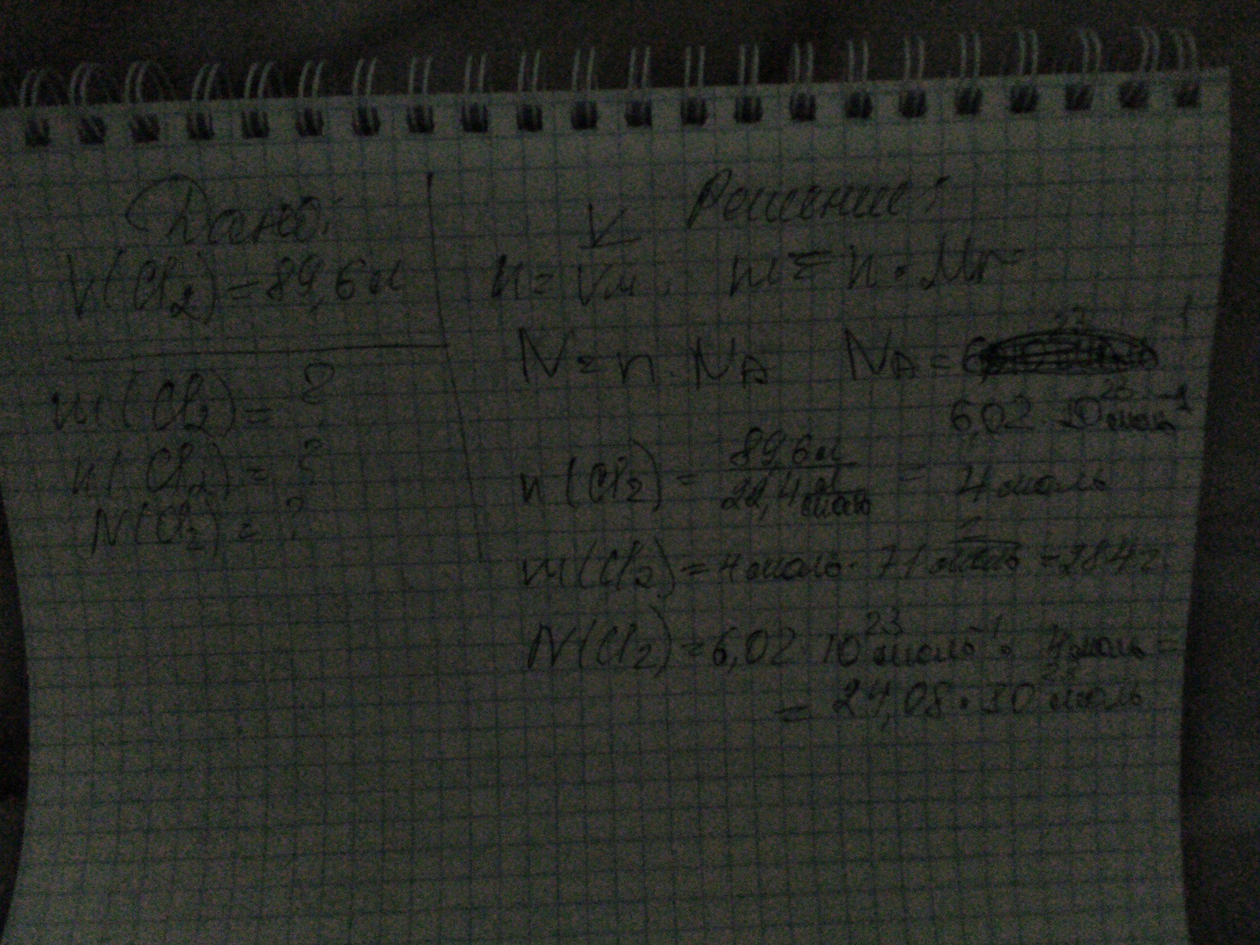 Помогите! Вопрос: Рассчитайте массу, количество вещества, число молекул 89,6 литров хлора СL2 при нормальных условиях. Заранее СПАСИБО!.