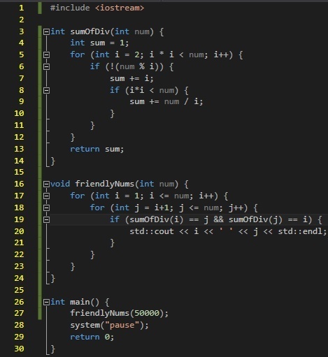 Два натуральных числа называются дружественными, если каждое из них равно сумме делителей другого (само другое число в качестве делителя не рассматривается). Найти все пары дружественных чисел меньших 50000