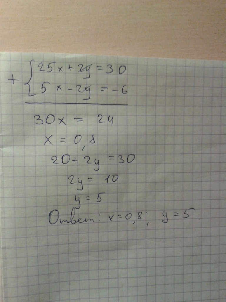 2.Решить систему уравнений. первое: 25х+2у=30 второе 5х-2у=-6