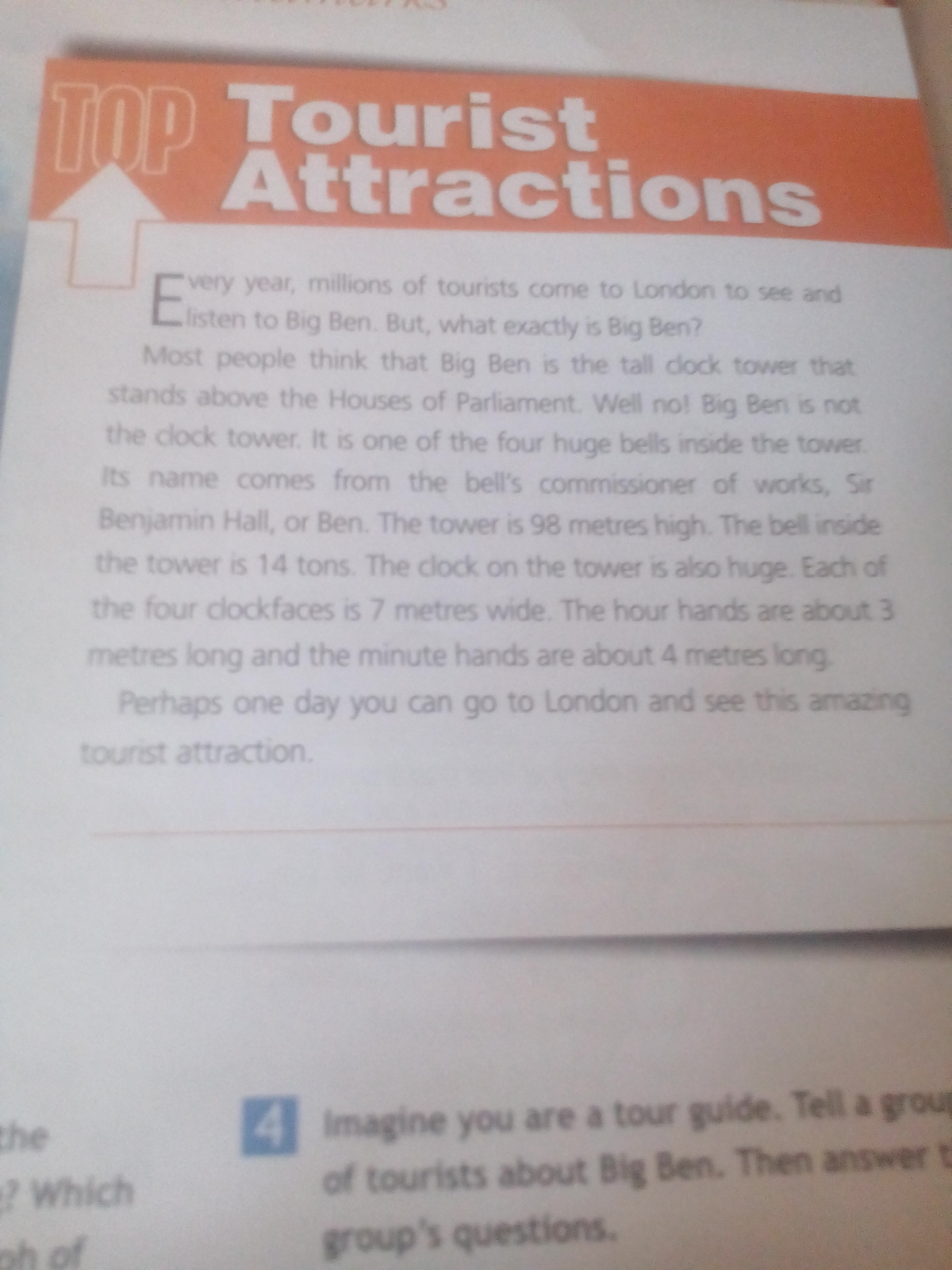Большинство людей думают, что Биг Бен это высокая башня с часами, которая стоит над Домом Парламента. Но нет! Биг Бен это не часовая башня. Это один из четырех огромных колоколов работы комиссара сэра Бэнджамина Холла или Бена. Башня высотой 98 метров. Колокол внутри башни такой же огромный. каждый из четырех часовых циферблатов 7 метров шириной. Часовые стрелки около 3 метров длиной, а минутные стрелки около 4 метров длиной. Возможно однажды ты сможешь поехать в Лондон и увидеть эту удивительную туристическую достопримечательность.
