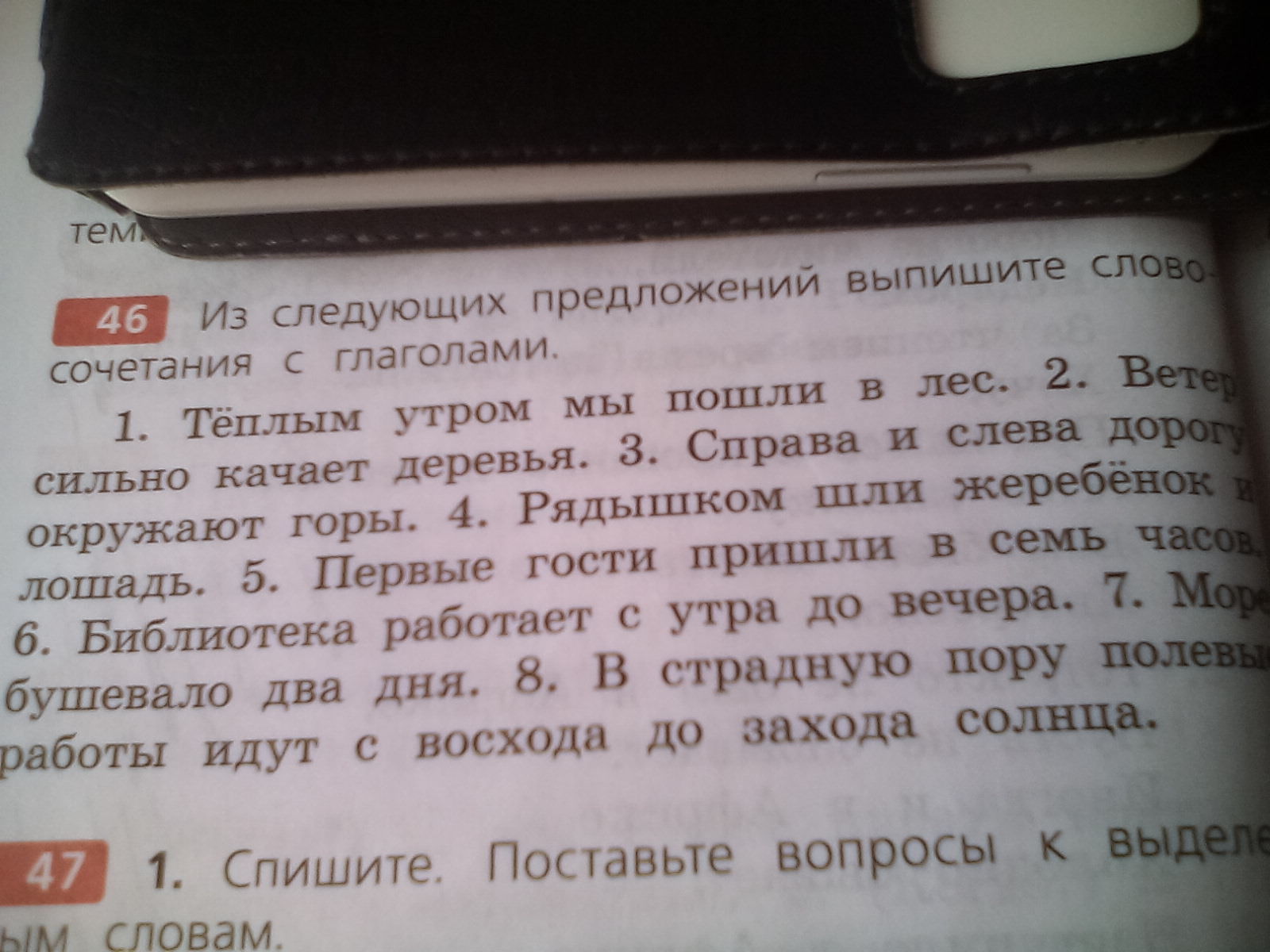 Мы пошли в лес,качает деревья,окружают горы,шли жеребёнок и лошадь,пришли в семь часов,работает с утра,море бушевало,идут с восхода