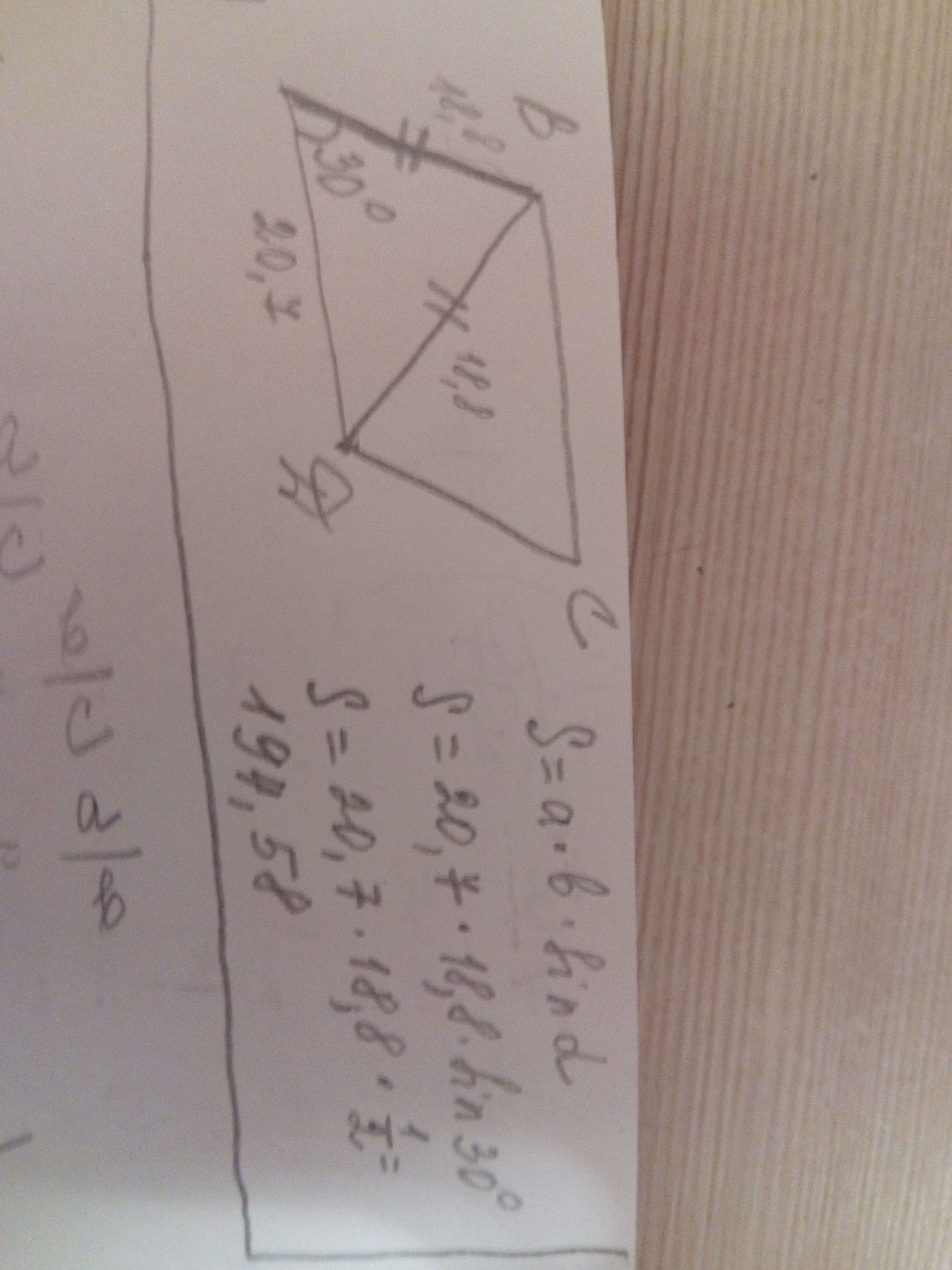 в параллелограмме диагональ ВD=18,8см и она равна стороне АВ , а угол А =30°. Найдите площадь параллеьограмма , если сторона АD=20,7 см