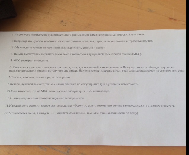 1. On how much I know there are many different houses in the UK in which they live lyudi.2. For example, this bungalows, townhouses, detached houses, apartments, country houses and terraced domiki.3. Usually the house has a living room, kitchen, dining room, bedroom and bathroom. 4. But I would like to tell you about the house in space, the International Space Station. 5. Mks size of three houses.