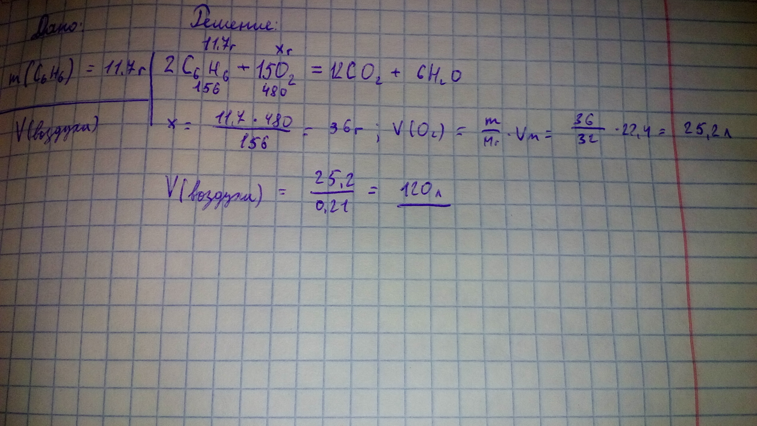 ДАМ 30 БАЛЛОВ,ПОЖАААЛУЙСТА, ОЧЕНЬ НУЖНО!! Помогите вычислить объем воздуха, требующегося для полного сгорания бензола массой 11,7 г