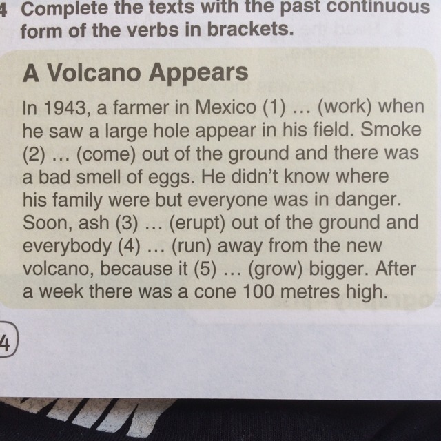 В 1943 году, крестьянин в Мексике (1) ...(работы), когда он увидел большие отверстия появляются в его поле. Дым (2) ... (прийти) из-под земли и был неприятный запах яиц. Он не знал, где его семья были, но все были в опасности. Вскоре, золы (3) ... (вспыхнуть) из земли и все (4) ... (запустить) от нового вулкана, потому что (5) ...(расти) больше. Через неделю там был конус высотой 100 метров.
