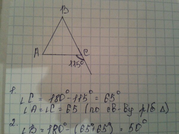 Один из внешних углов равнобедренного треугольника равен 115 градусов. Найдите углы равнобедренного треугольника