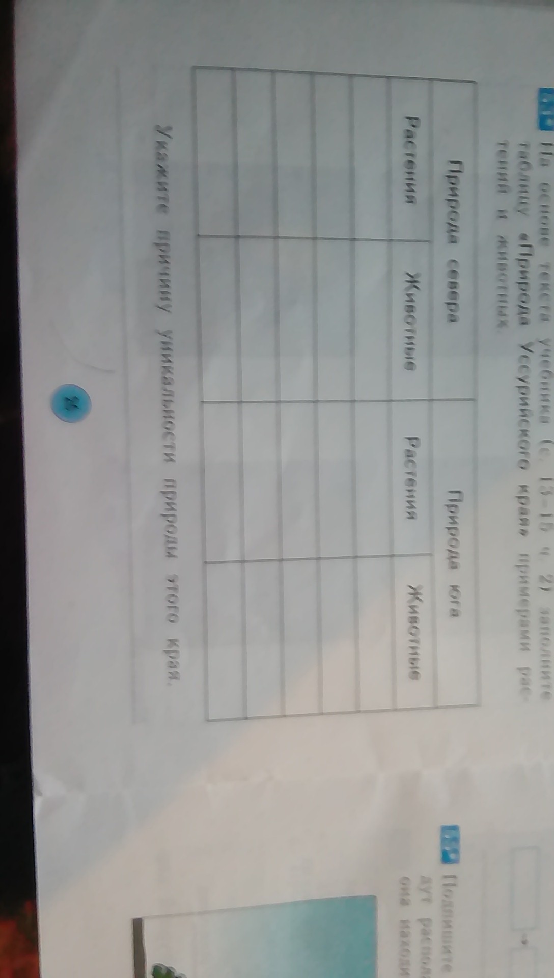 На основе текста учебника (с. 13-15 ч. 2) заполните таблицу <<Природа Уссурийского края>> примерами растений и животных. Укажите причину уникальности природы этого края.