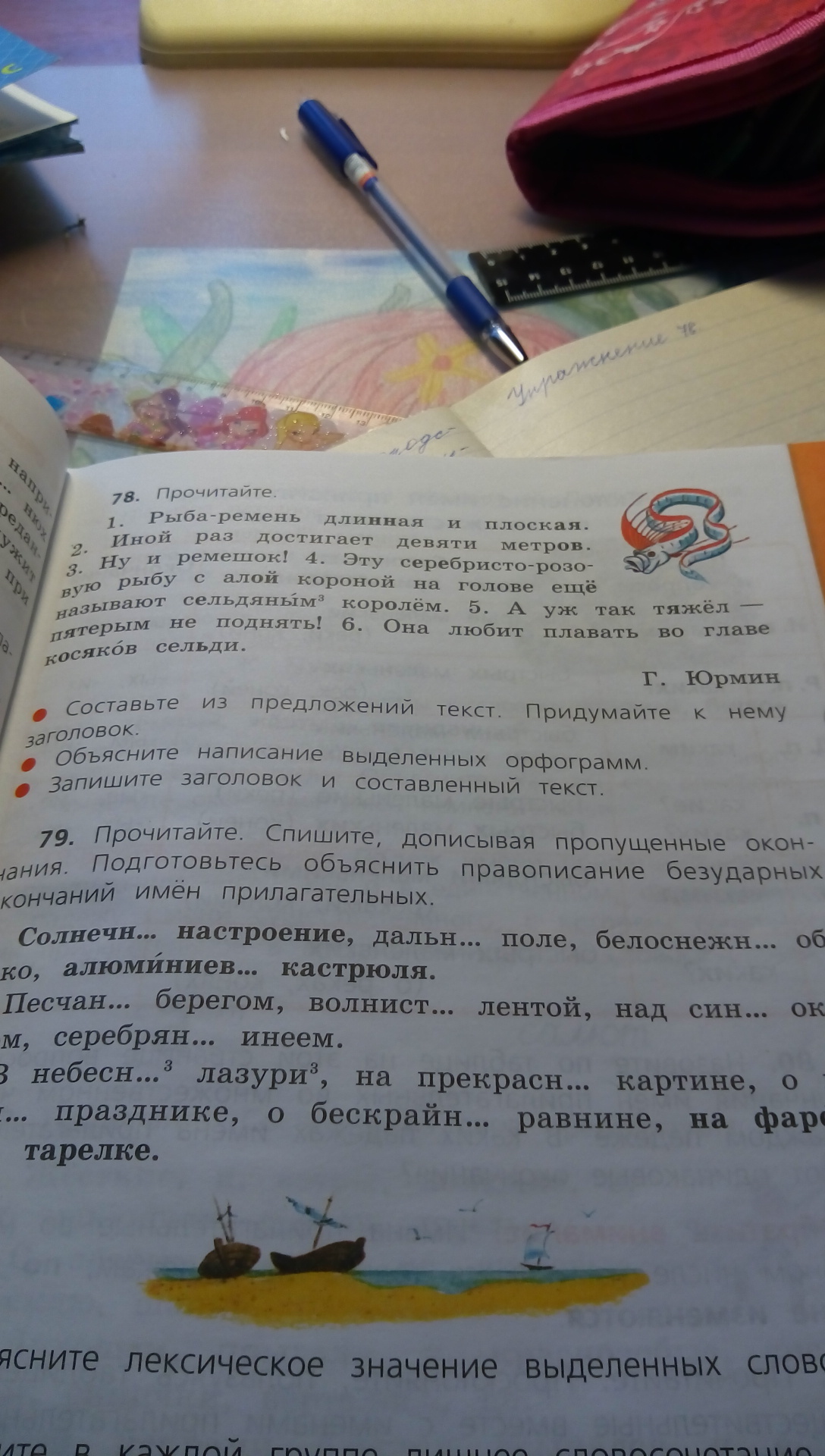 Король сельди. Эту серебристо-розовую рыбу с алой короной на голове называют сельдяным королём.Она любит плавать во главе косяков сельди.Рыба-ремень длинная и плоская.Иной раз достигает девяти метров.Ну и ремешок!А уж так тяжёл-пятерым не поднять. Сельдяным-прилагат.,м.р относительное полное Т п в предлож является определением
