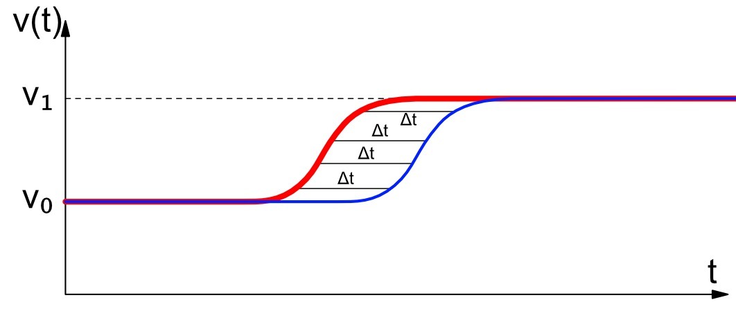 Об этой петле мы знаем ее "высоту" (v₁-v₀), а кроме того знаем, что любое ее горизонтальное сечение имеет длину Δt. Согласно принципу Кавальери, площадь этой криволинейной фигуры будет равна площади прямоугольника с той же высотой и длиной.