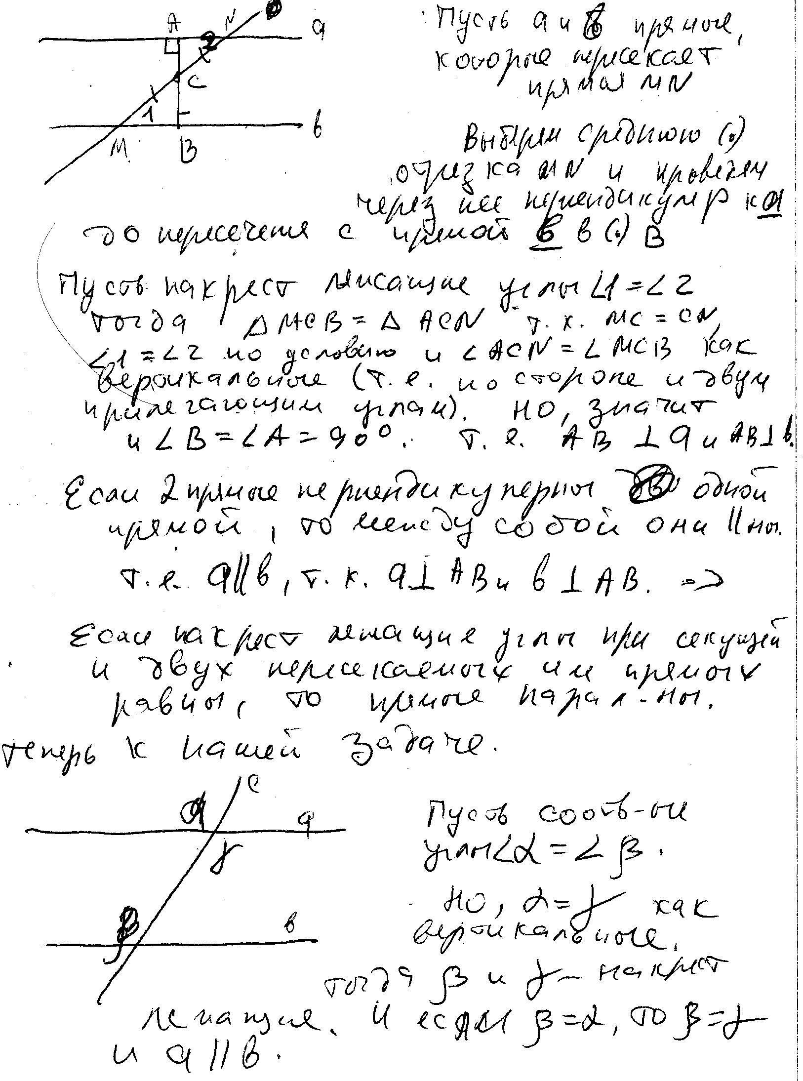 Докажите ,что если при пересечении двух прямых секущей соответственные углы равны ,то прямые паралельны.
