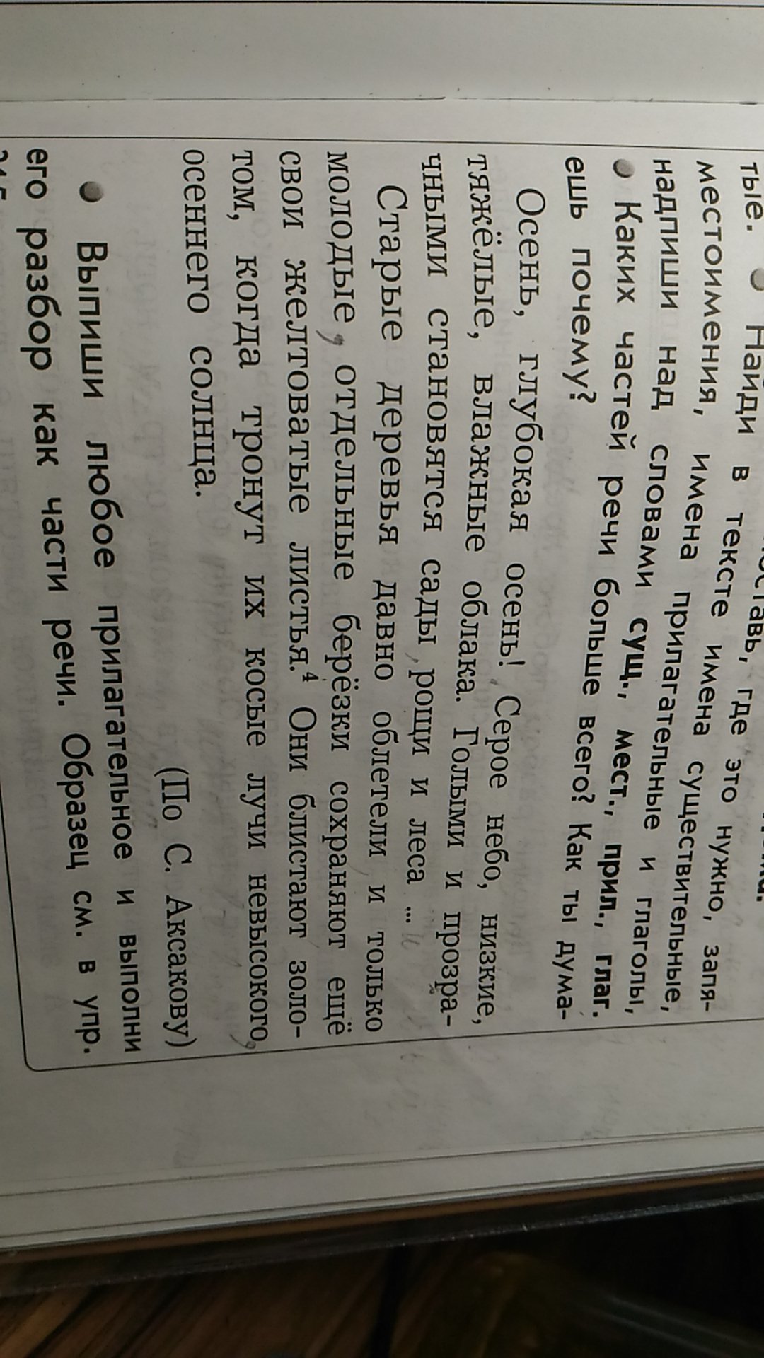 сущ осень,гл глубокая,серое прил,небо сущ,низкие,тяжелые,влажные это прил,облака сущ,голыми и прозначными это прил,становятся гл,сады сущ,рощи леса сущ