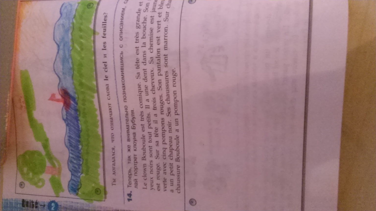 Его ботинки коричневые.Дальше опять не видно:"Sur cha...chaussure Bouboule à un pompons rouge"