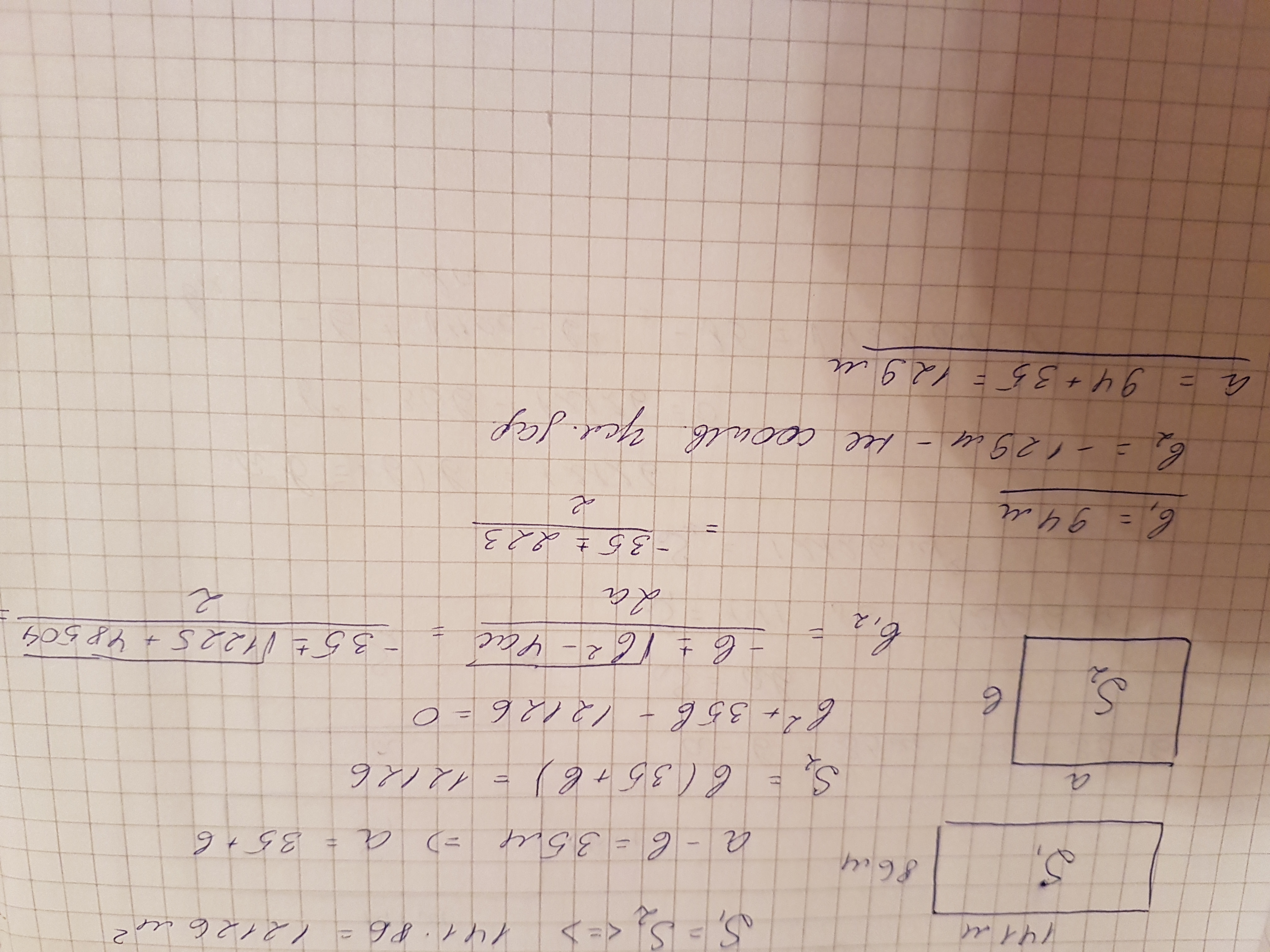 Прямоугольный участок с измерениями 141 и 86 м заменили другим участком такой же площади, у которого длинна больше ширины на 35 м, Найдите измерения другого участка
