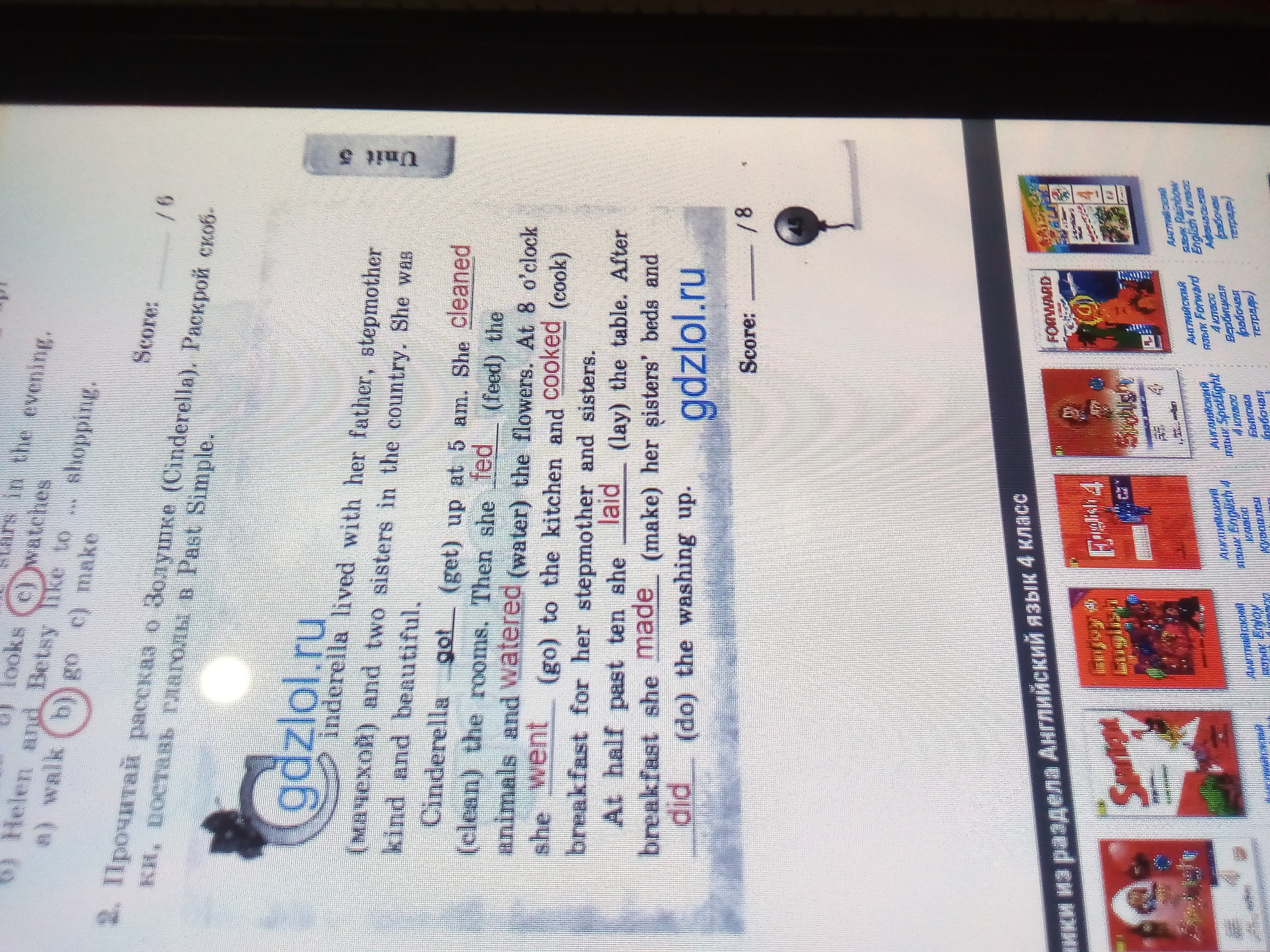 Синдерелла встала в 5 утра. Она убрала комнаты. Затем покормила зверей и полила цветы. В 8 часов она пошла на кухню и приготовила завтрак для её мачехи и сестер. В пол одиннадцатого она накрыла стол. После завтрака она заправила кровати своих сестер и помыла посуду.