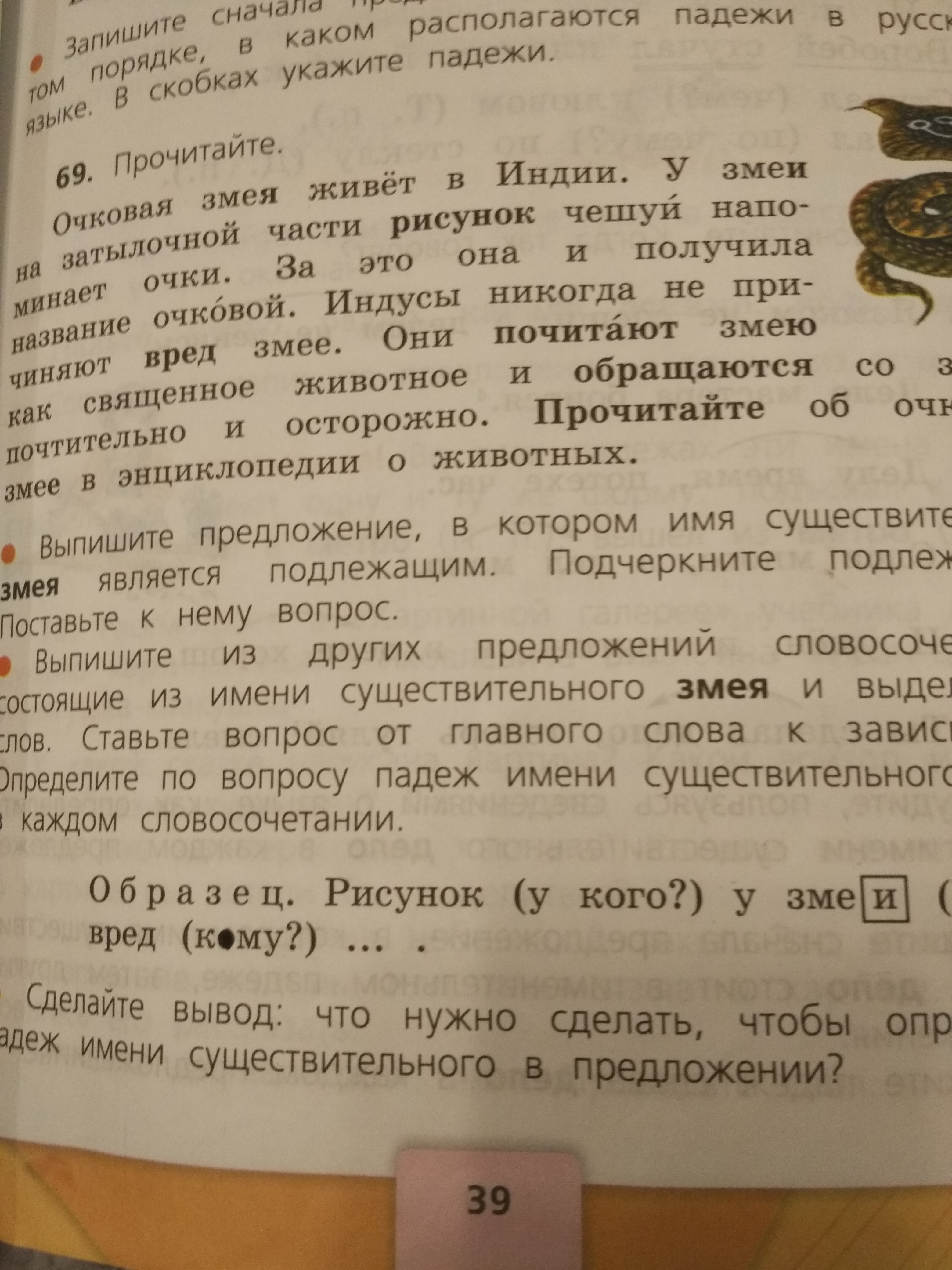 Почитают (кого?) змею, обращаются (с кем?) со змеёй, прочитаете (о ком?) об очковой змее