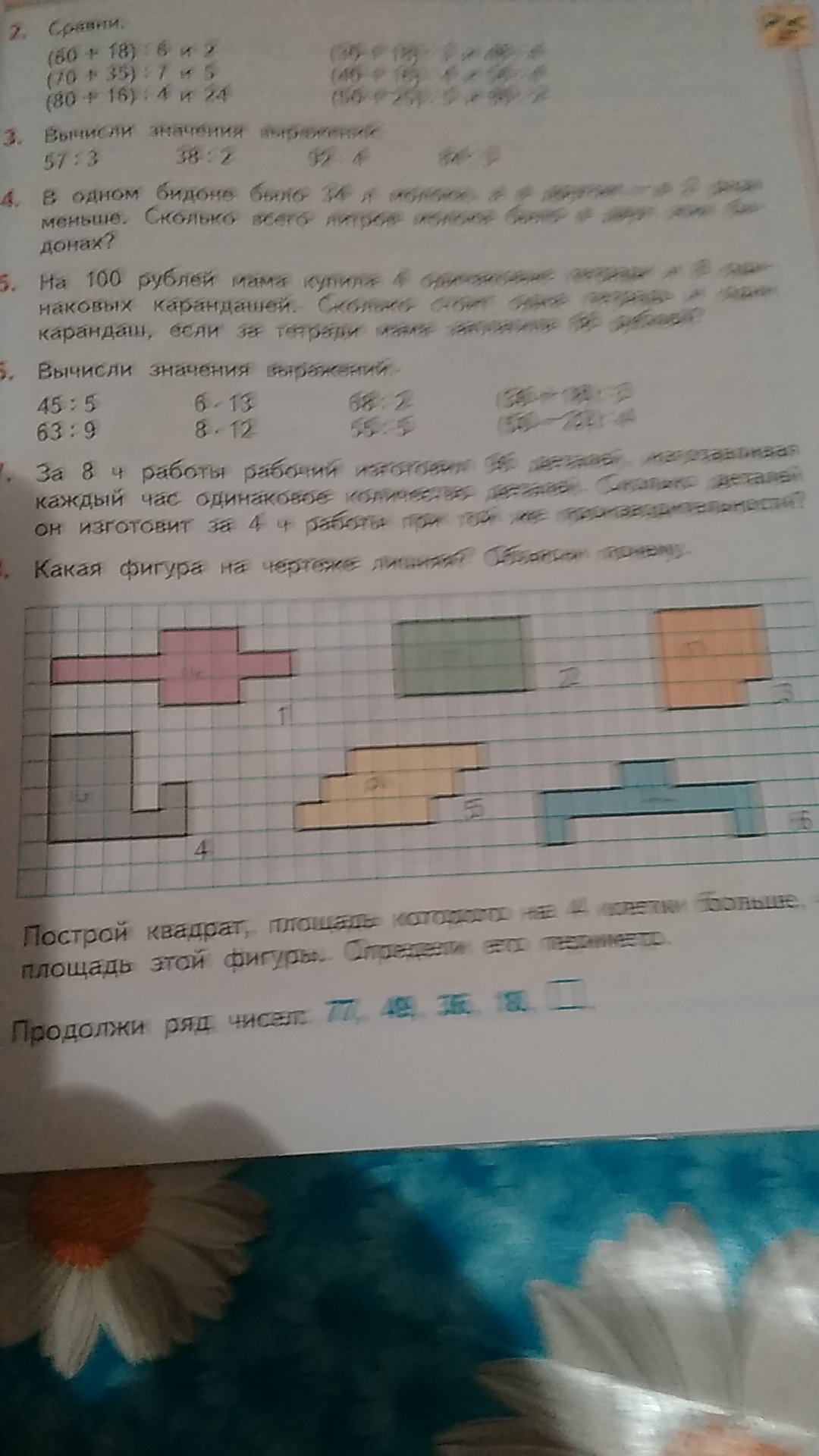 какая фигура на чертеже лишняя? Обьясни почему. Построй квадрат площадь которого на 4 клетки больше,чем площадь этой фигуры.Определи его периметр