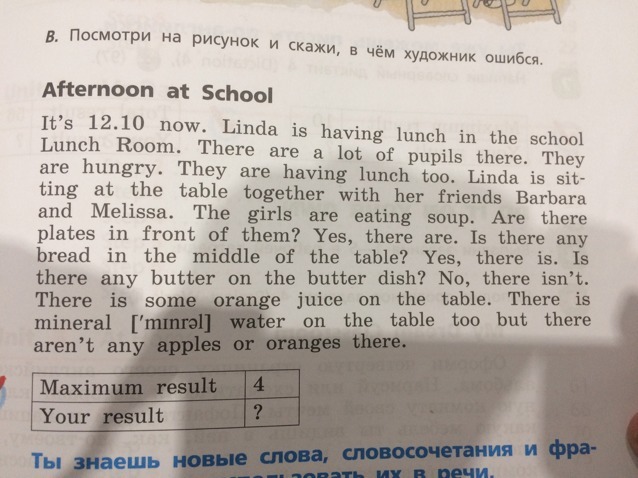 Сейчас 12,10. Линда обедает в школьной столовой. Здесь много учеников. Они голодны. Они тоже обедают. Линда сидит за столом со своими друзьями Барбарой и Мелиссой. Девочки едят суп. Тарелки стоят спереди них? Да. Есть хлеб в середине стола? Да. Есть ли масло в тарелке для масла? Нет. Здесь есть немного апельсинового сока на столе. Так же на столе есть минералка,но здесь нет яблок ии апельсинов.
