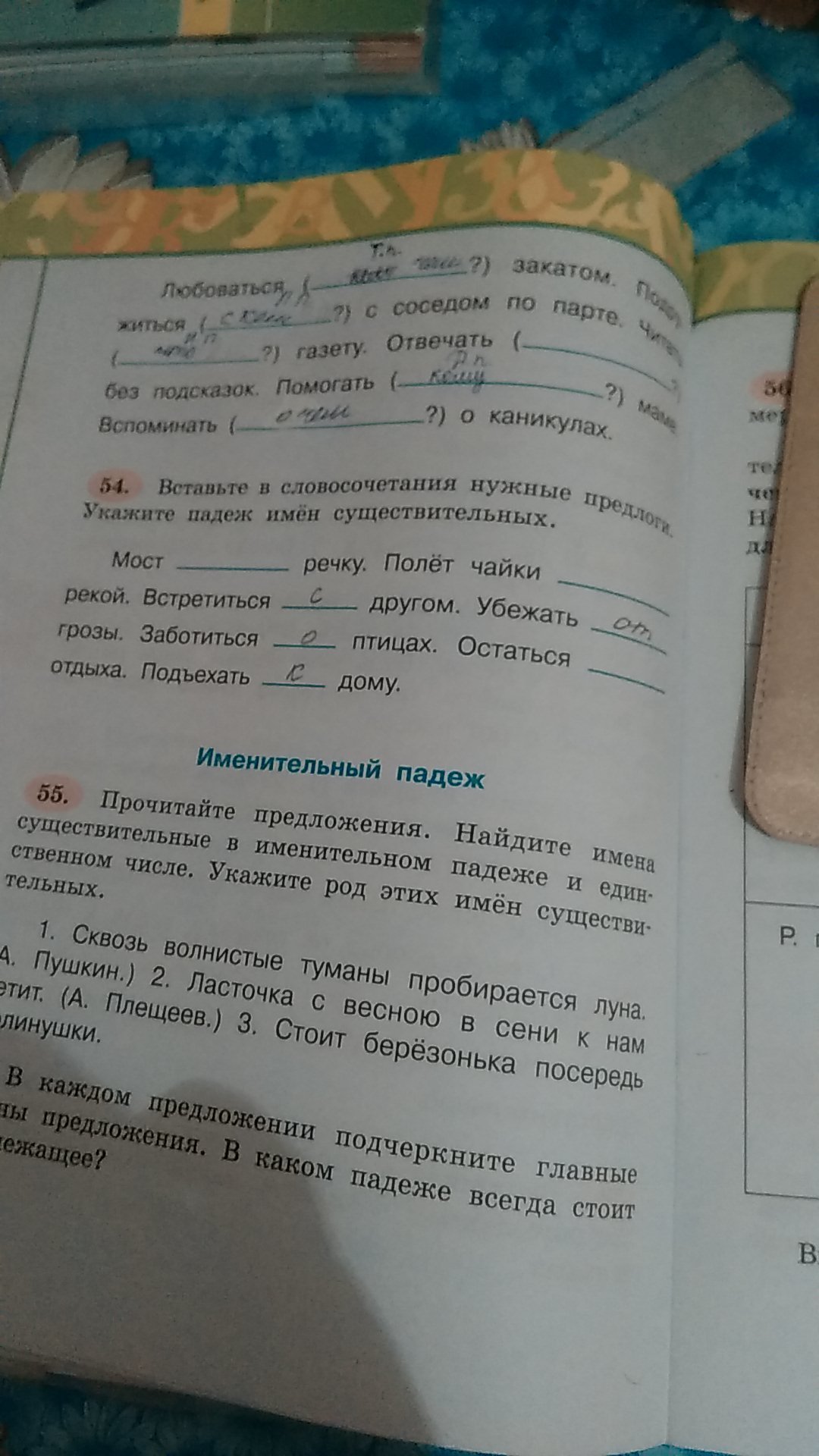 1.Мост через речку; 2.полет яайки над рекой; 3.остаться у отдыха; 1. И.п 2. Р.п 3. Нету подлежащего