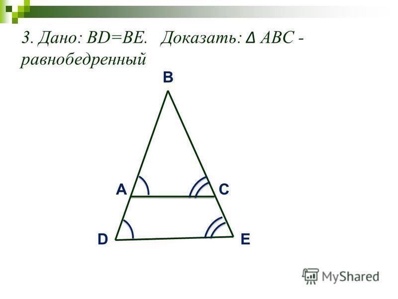BD=BE⇒ΔDBE равнобедренный⇒ ∠D=∠E ⇒ ∠A=∠D=∠E=∠C; углы A и C равны⇒ΔABC равнобедренный