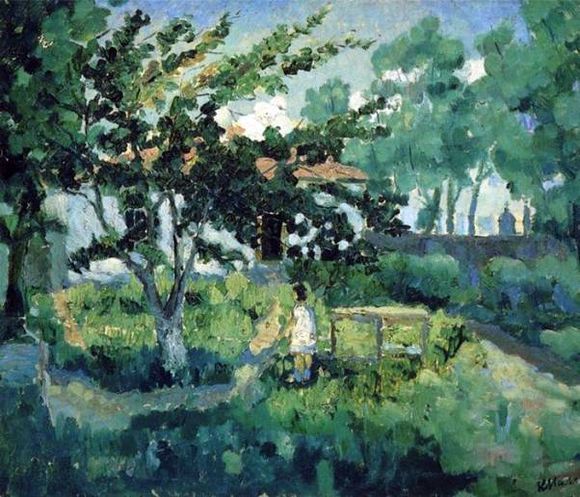 Я смотрю на картину Малевича «Летний пейзаж», которая написана в стиле импрессионизма. На картине изображен теплый летний денек. Под пышным деревом стоит девочка в белом платьице. Мы видим протоптанные тропинки, которые ведут к уютному дачному дому. Справа вверху зритель может разглядеть очертания местной церквушки.
