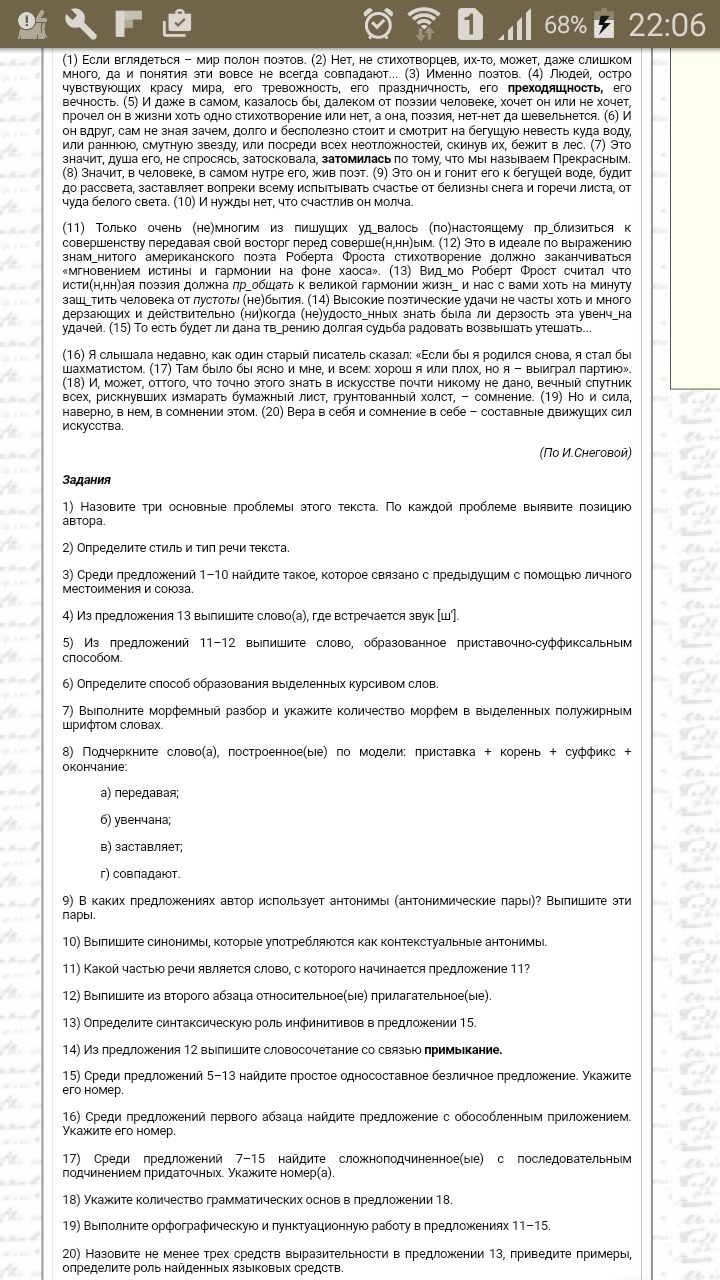 Задание№19. 11)Только очень немногим из пишущих удавалось по-настоящему приблизиться к совершенству, передавая свой восторг перед совершенным. (12)Это в идеале, по выражению знаменитого американского поэта Роберта Фроста, стихотворение должно заканчиваться «мгновением истины и гармонии на фоне хаоса». (13)Видимо, Роберт Фрост считал, что истинная поэзия должна приобщать к великой гармонии жизни и нас с вами, хоть на минуту защитить человека от пустоты небытия. (14)Высокие поэтические удачи не часты, хоть и много дерзающих и действительно никогда не удостоенных знать, была ли дерзость эта увенчана удачей. (15)То есть будет ли дана творению долгая судьба радовать, возвышать, утешать...