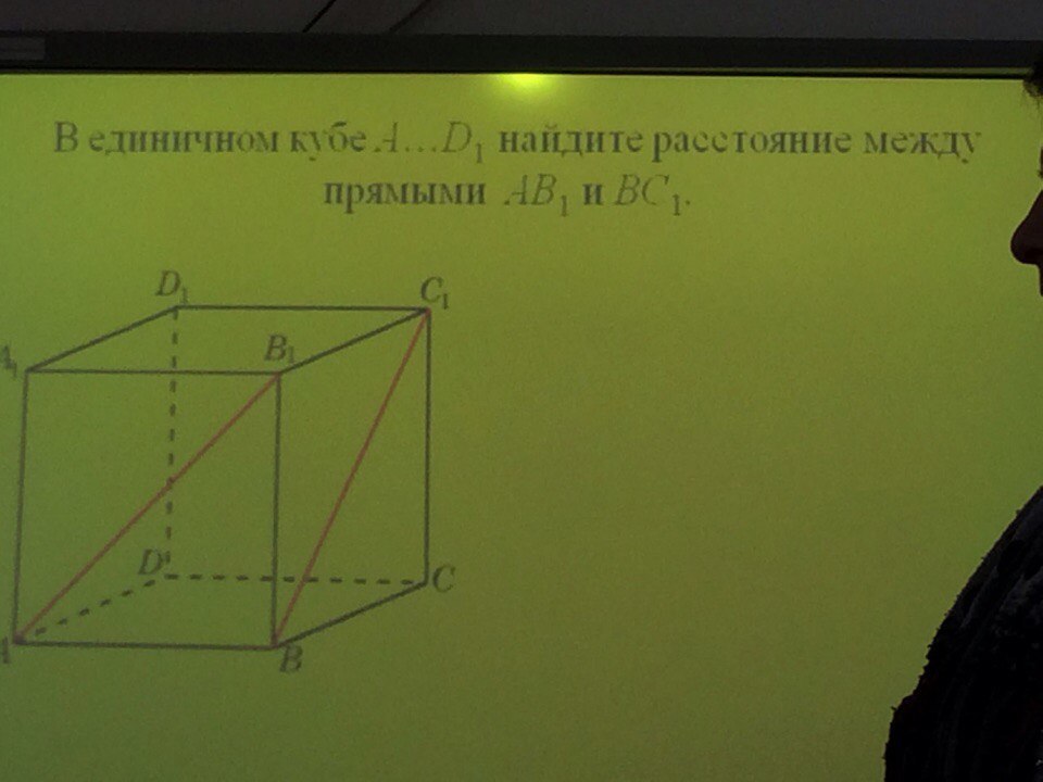 2) Находим расстояние O1EO1E:По свойствам кубаBD=BC1=DC1=2–√, O1C1=2–√2, OC1=6–√2, OO1=1BD=BC1=DC1=2, O1C1=22, OC1=62, OO1=1∠O1EC1=90∘∠O1EC1=90∘ — по построению∠OO1C1=90∘∠OO1C1=90∘ — потому что прямая OO1OO1 перпендикулярна плоскости A1B1C1A1B1C1Из прямоугольного треугольника OO1C1OO1C1sinO1C1O=OO1OC1sinO1C1O=OO1OC1Из прямоугольного треугольника EO1C1EO1C1sinO1C1O=O1EO1C1sinO1C1O=O1EO1C1Приравниваем правые части уравнений друг другуOO1OC1=O1EO1C1OO1OC1=O1EO1C1ВыражаемO1EO1EO1E=O1C1⋅OO1OC1=2–√2⋅13√2√=13–√