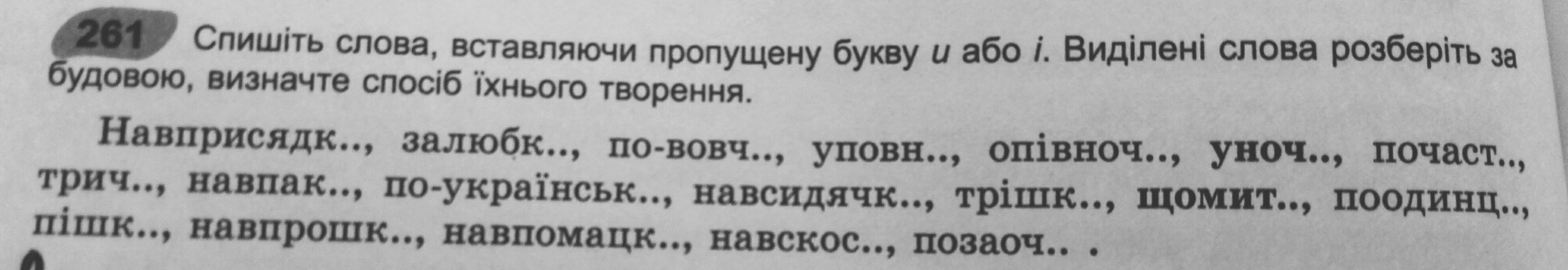 Навприсядки, залюбки, по - вовчи, уповні, опівночі, уночі, почасти, тричі, навпаки, по - українськи, навсидячки, трішки, щомиті, поодинці, пішки, навпрошки, навпомацки, навскоси, позаочі.