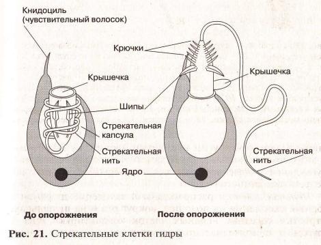 Стрекательные клетки - служат для защиты и нападения. Крупная клетка со стрекательной капсулой с ядом, внутри которой свернутая стрекательная полая нить. На поверхности клетки чувствительный волосок . Отличительный признак кишечнополостных. Строение смотрите во вложении