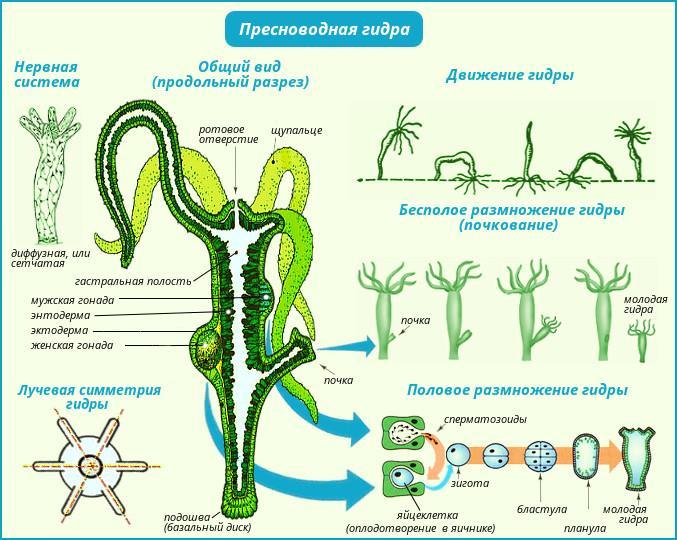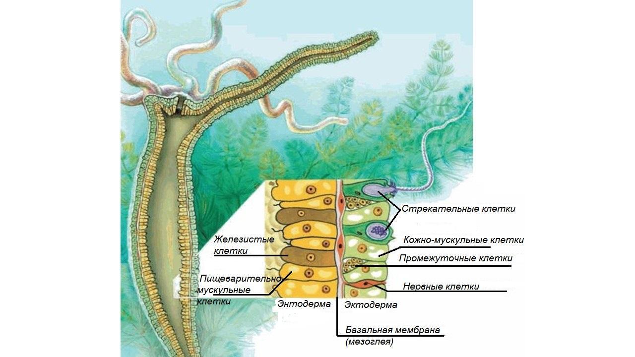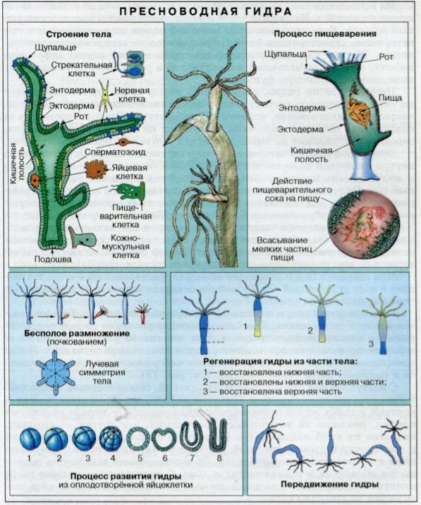 Двуслойные животные. Внешний слой - эктодерма, внутренний слой - энтодерма. Между ними мезоглея - неклеточное студенистое вещество. Имеют радиальную симметрию. Гидра маленькое полупрозрачное животное. Тело стоит из стебелька и подошвы. Подошва служит для прикрепления тела к субстрату. Стебелек - тело, в котором находится кишечная (гастральная) полость. Ротовое отверстие расположено на верху и окружено щупальцами. Органов и тканей нет. Клетки дифференцированы. Способны к регенерации.
