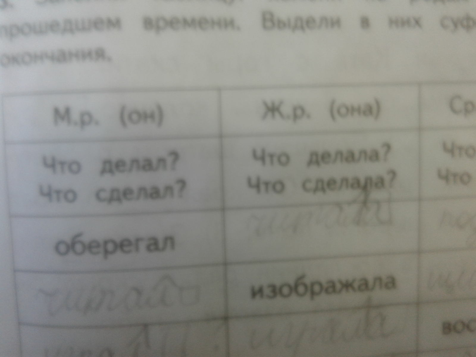 заполни таблицу Измени по родам глаголы прошедшего времени Выдели в них суффиксы и окончания мужской род он Что делал Что сделал оберегал иллюстрировал женский род анна что дело что сделала изображала интересовало средний род анна Что делала Что сделала восхищалась съежилась
