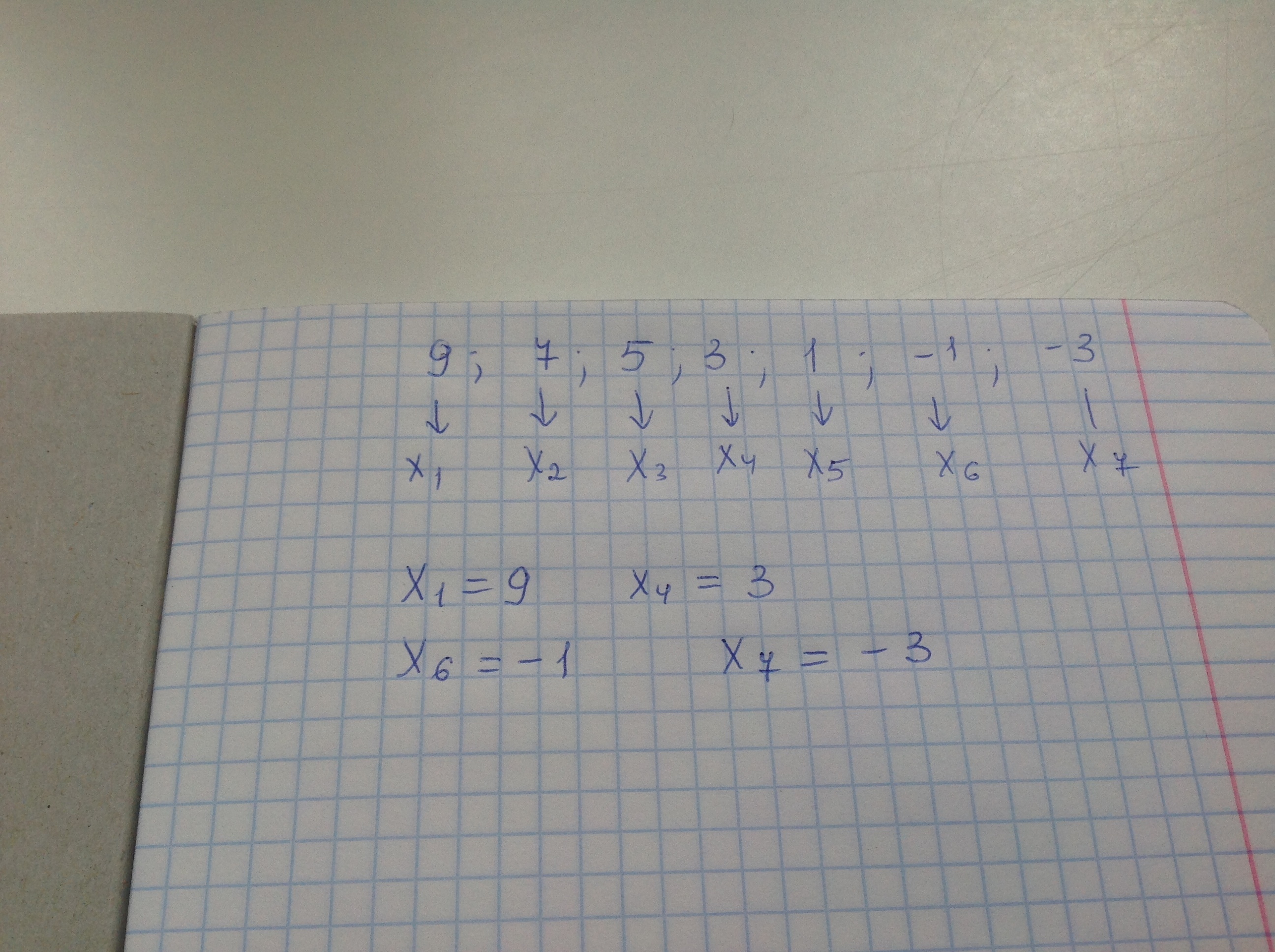 . В последовательности (хn): 9; 7; 5; 3; 1; -1; -3 выпишите 1-й, 4-й, 6-й и 7-й члены.плеас помогите очень надо
