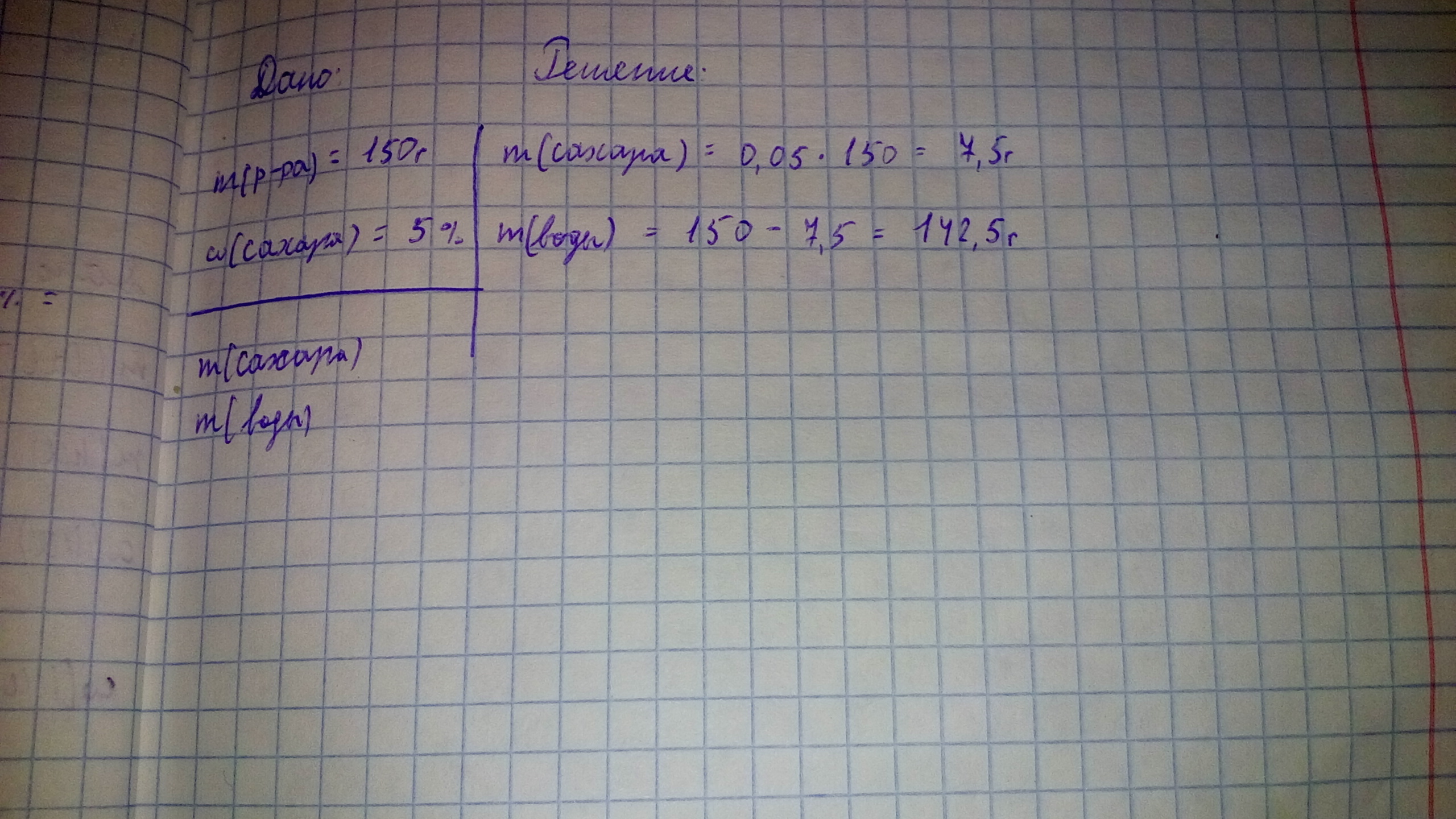 Для приготовления 150г 5%-ого раствора сахара надо взять 7,5г сахара и 142,5г воды. См. фото.