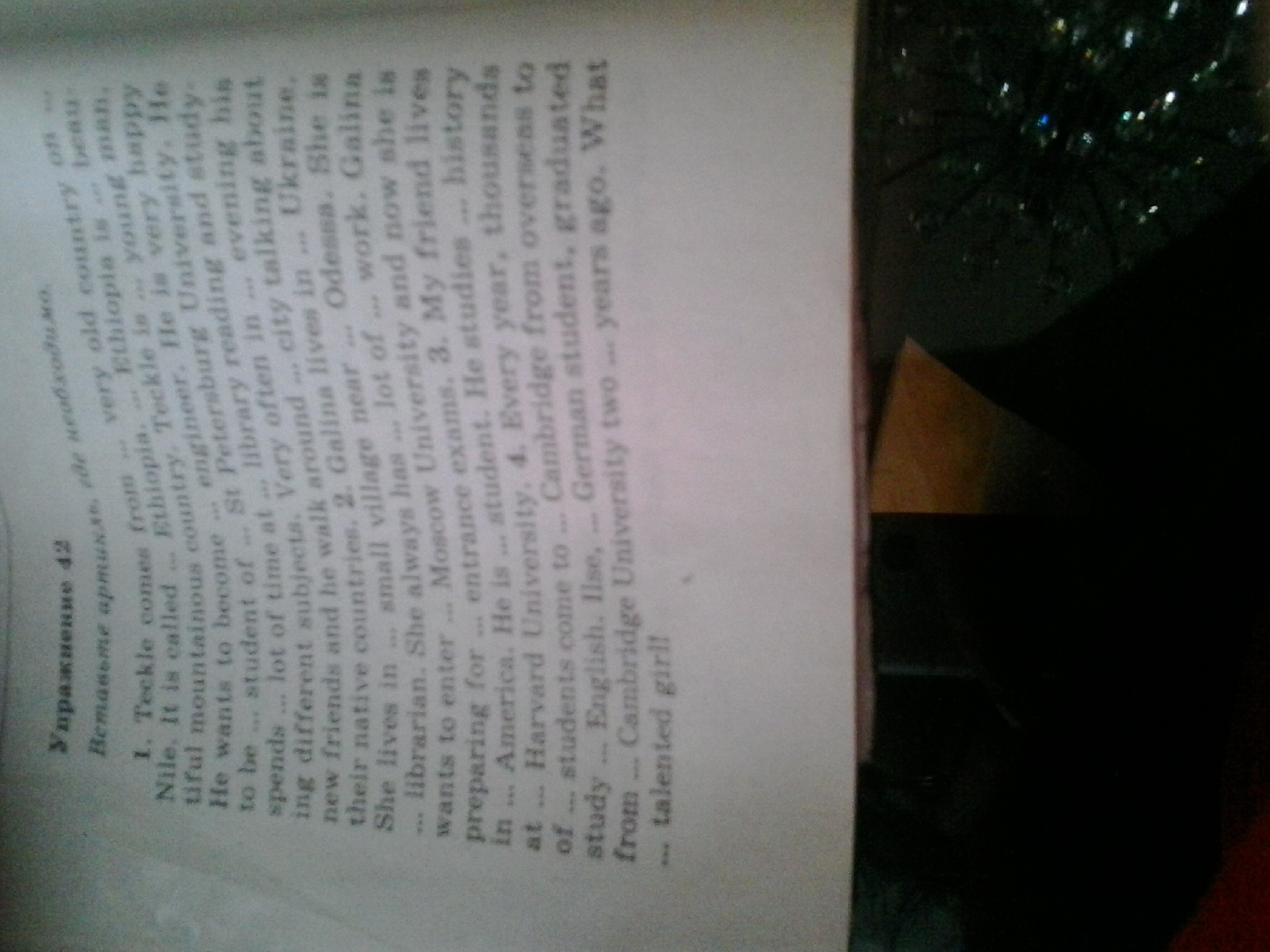 1 teckle comes from very old country in the Nile. It called ethiopia. Ethiopia is a beautiful mountainous country. Teckle is an young man. He want to become an enigeer . He is very happy to be a student of st. Petersburg university. He spends a lot of time at the library reading and studying different subjects. Very often in the evening his new friends abs he work around the city. 2 galina lives in Ukraine. She lives in a small village near odessa. She is a librarian . She always has a lot of work. Galina wants to enter moscow university and now she is preparing for entrance exams. 3 my friend lives in America. He is a student. He studies history at Harvard University. 4. Every year thousands of students come to Cambridge from overseas to study english . German students graduated from Cambridge University two years ago. What a talented girl!