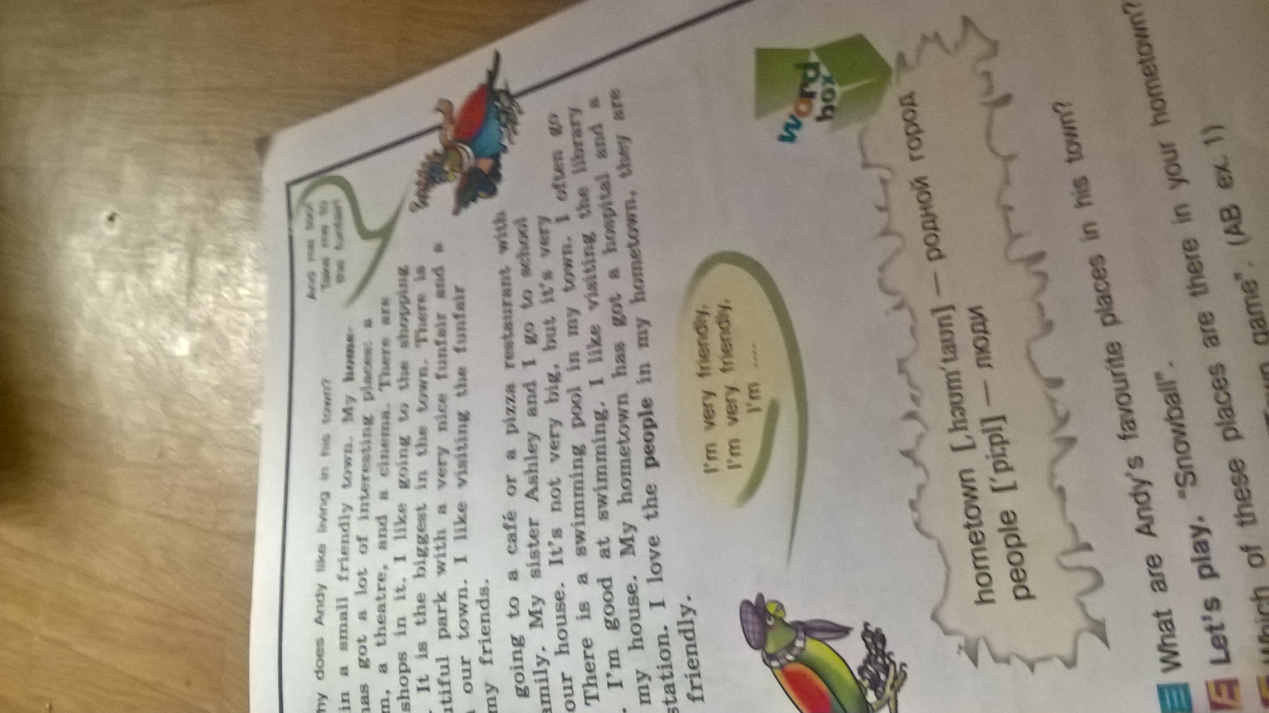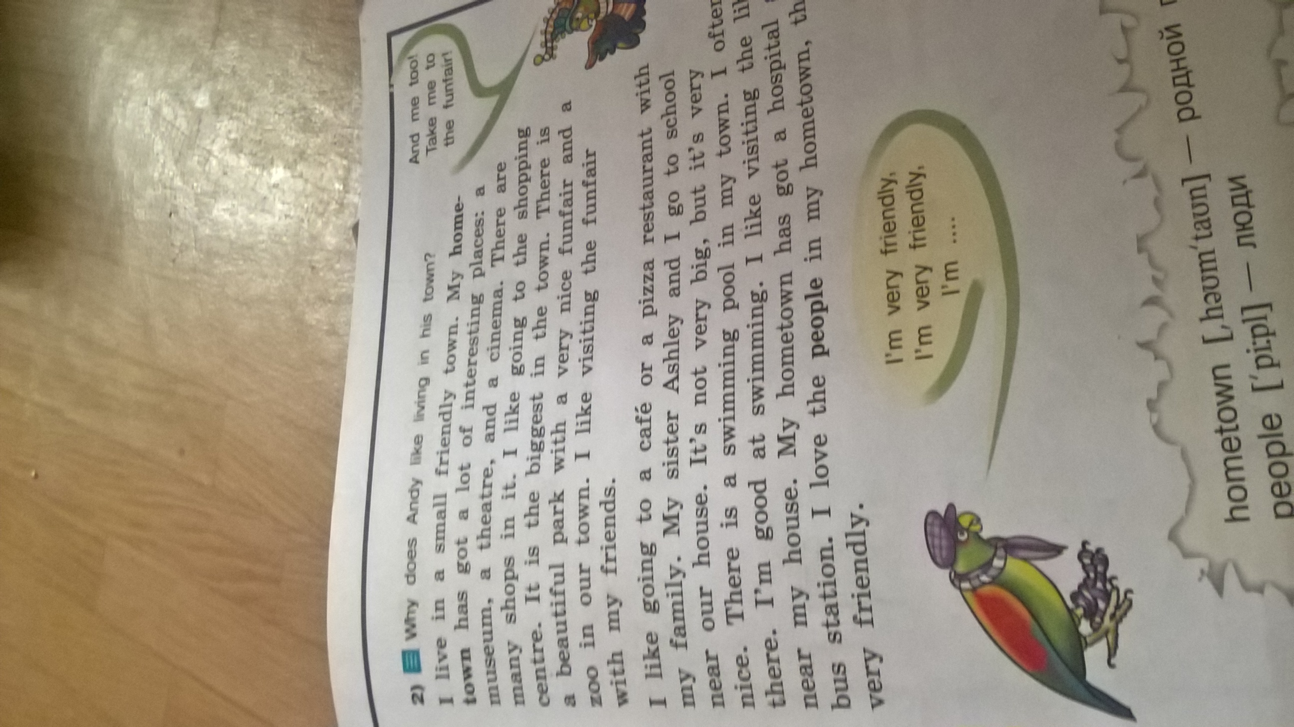 я живу в маленьком дружелюбном городе. в моем родном городе много интересных мест: музей, театр и кинотеатр. в нем есть много магазинов. мне нравится ходить в торговый центр. он самый большой в городе. в нашем городе очень красивый парк с очень хорошими атракционами. мне нравится посещать аттракционы с моими друзьями. я люблю ходить в кафе или пиццерию с своей семьёй. моя сестра Эшли и я ходим школу рядом с нашим домом. она не очень большая, но очень хорошая. в моем городе есть бассейн. я часто там. я хорош в плаванье. я люблю посещать библиотеку рядом с нашим домом. в моем городе есть больница на автобусной остановке. мне нравятся люди в моем родном городе. они очень дружелюбные.
