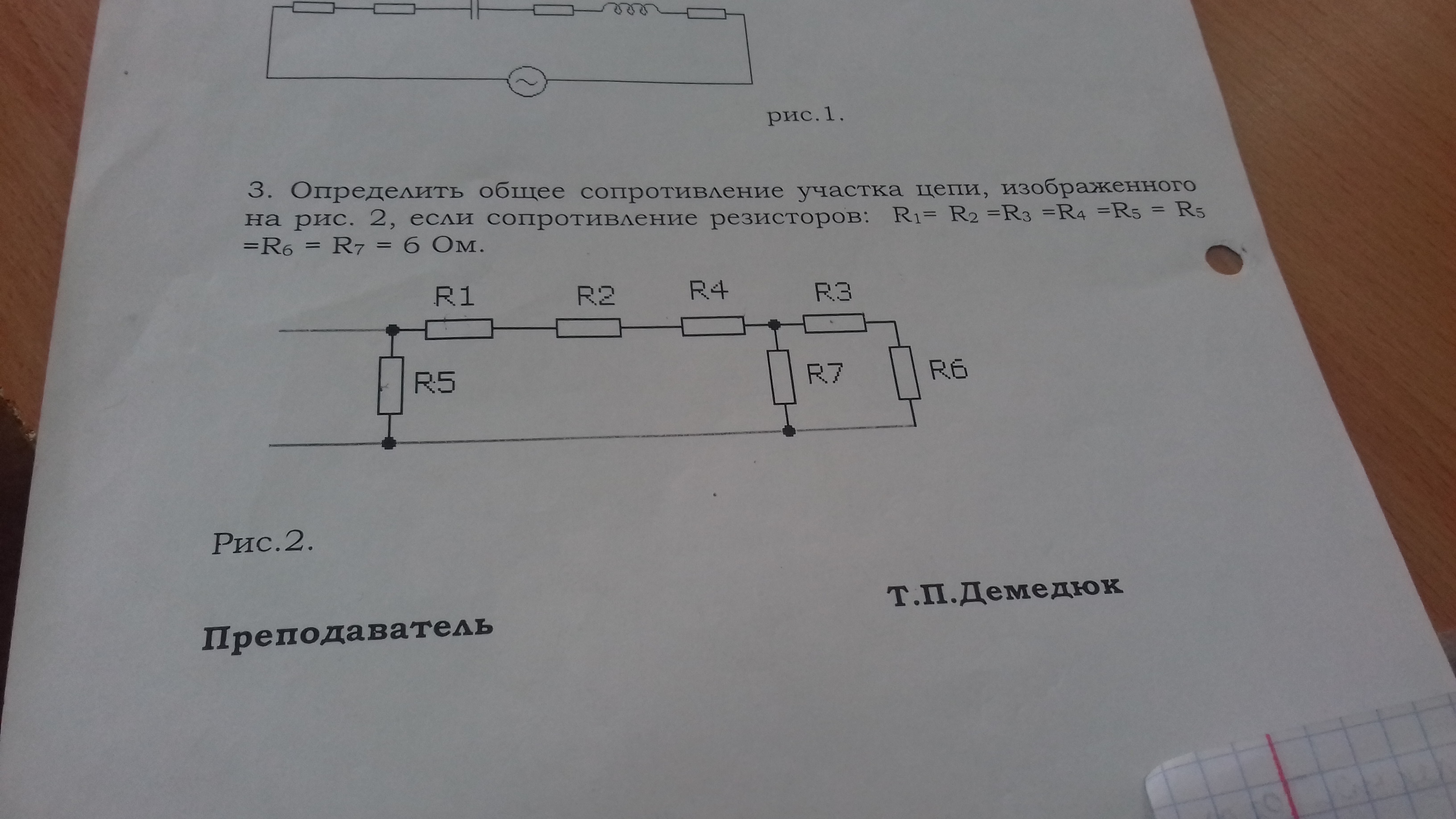 Определить общее сопротивление участка цепи,изображенного на рис 2 если сопротивление резисторов R1=R2=R3=R4=R5=R5=R6=R7=6 Ом