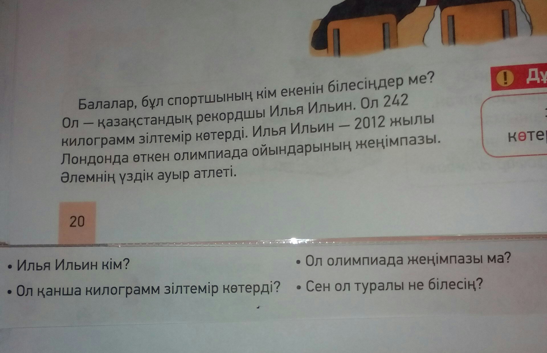 1) Казакстандык рекордшы 2)242 кг 3)иа 4)Илья Александрович Ильин - Қазақстандық зілтемірші Қазақстандық тұңғыш олимпиада ойындарының екі дүркін чемпионы , әлемнің төрт дүркін чемпионы және Қазақстан чемпионы . Қазақстанның еңбек сіңірген спорт шебері. "Динамо" спорт клубының құрамында өнер көрсетеді. Қазақстан Республикасы Ұлттық қауіпсіздік комитеті Шекара қызметінің аға лейтенанты.