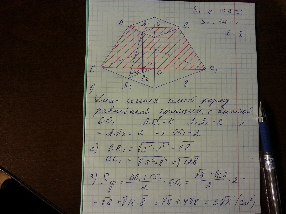 Площади оснований правильной 4-х угольной усеченной пирамиды равны 4 и 64 см^2,а боковое ребро образует с плоскостью основания угол 45 градусов.Найдите площадь диагонального сечения пирамиды. Пожааалуйста помогите,очень надо!