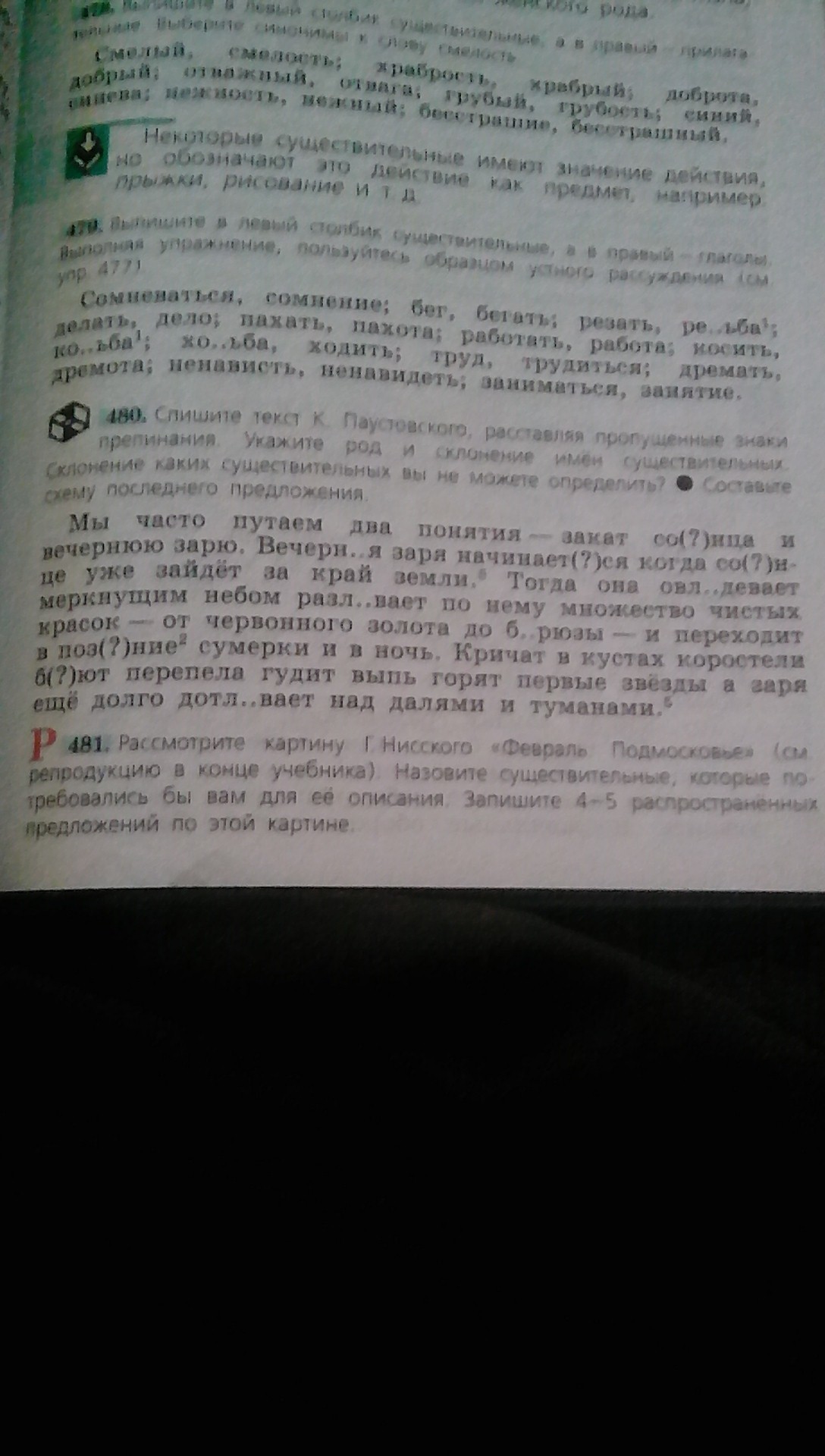 Понятия (ср.р), закат (м.р., 2скл.), солнца (с.р, 2скл), зарю (ж.р. 1скл), край (м.р. 2скл), земли (ж.р, 1скл), небом (ср.р., 2скл), множество (ср.р., 2скл), красок (ж.р., 1скл), золото (ср.р., 2скл), бирюзы (ж.р, 1скл), ночь (ж.р. 3скл), кустах (м.р, 2скл), коростели (м.р, 2скл), выпь (м.р, 2скл), выпь (ж.р, 3 скл), звёзды (ж.р, 1скл), далями (ж.р., 3скл), туманами (м.р, 2скл).