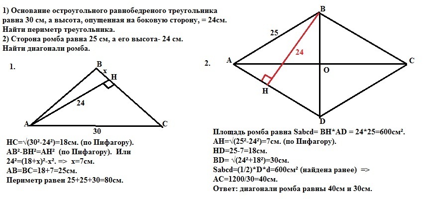 1) Основание остроугольного равнобедренного треугольника равна 30 см, а высота, опущенная на боковую сторону, = 24см.